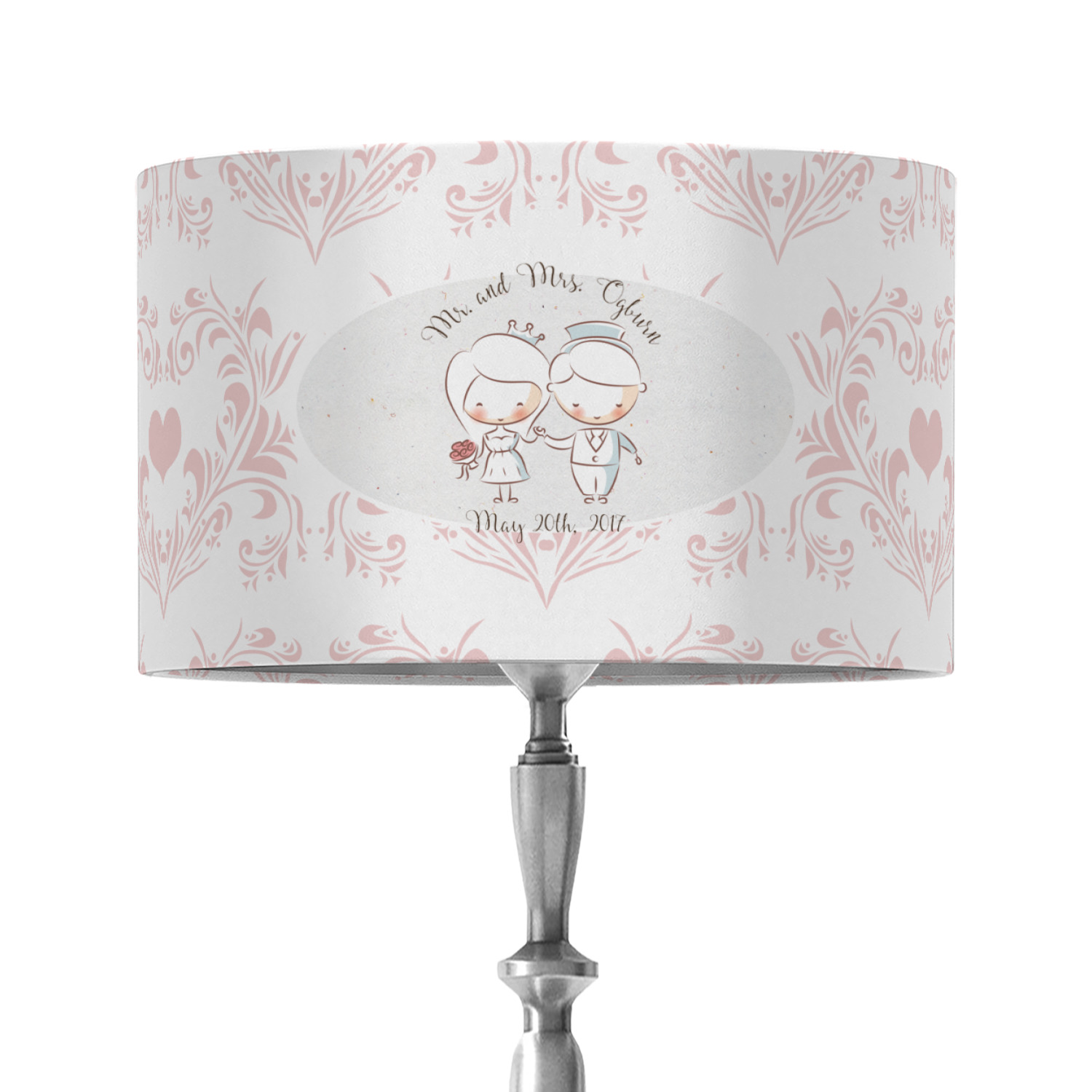 This design has an adorable bride and groom at the center of attention. They sit holding hands on a speckle textured off-white background. Above and below them is where the personalization goes, with the bride and groom's names and wedding date or whatever you choose. The textured background is a circle that surrounds the bride and groom while another background sits behind this circle. The secondary background is a white and light pink heart damask pattern, which looks adorable with the couples and their sweet rosy cheeks.