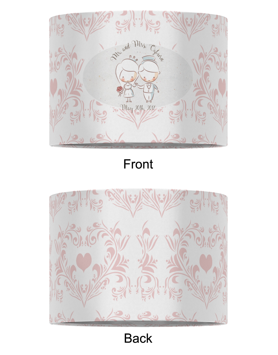 This design has an adorable bride and groom at the center of attention. They sit holding hands on a speckle textured off-white background. Above and below them is where the personalization goes, with the bride and groom's names and wedding date or whatever you choose. The textured background is a circle that surrounds the bride and groom while another background sits behind this circle. The secondary background is a white and light pink heart damask pattern, which looks adorable with the couples and their sweet rosy cheeks.