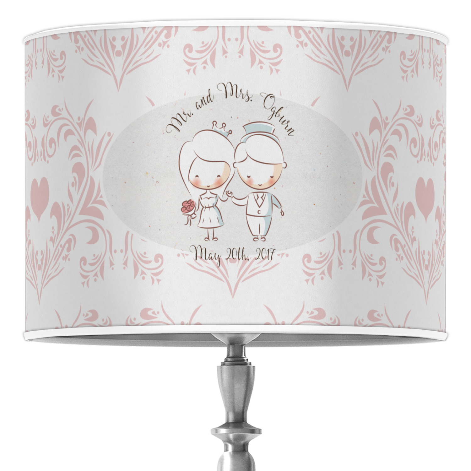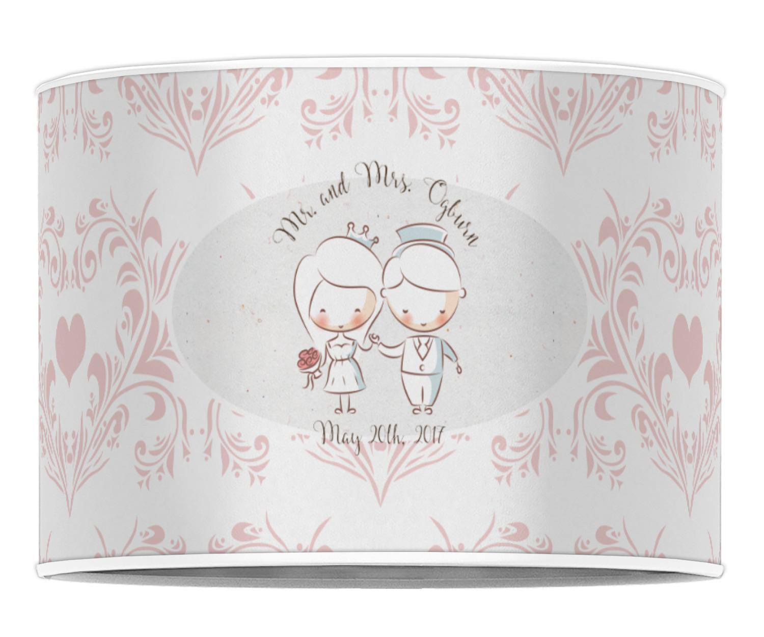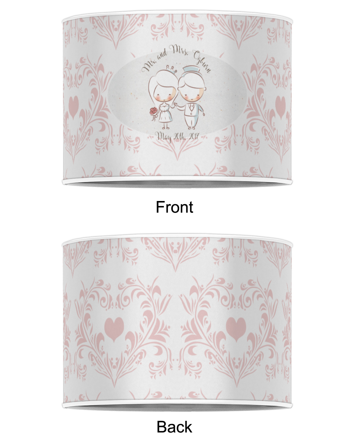 This design has an adorable bride and groom at the center of attention. They sit holding hands on a speckle textured off-white background. Above and below them is where the personalization goes, with the bride and groom's names and wedding date or whatever you choose. The textured background is a circle that surrounds the bride and groom while another background sits behind this circle. The secondary background is a white and light pink heart damask pattern, which looks adorable with the couples and their sweet rosy cheeks.