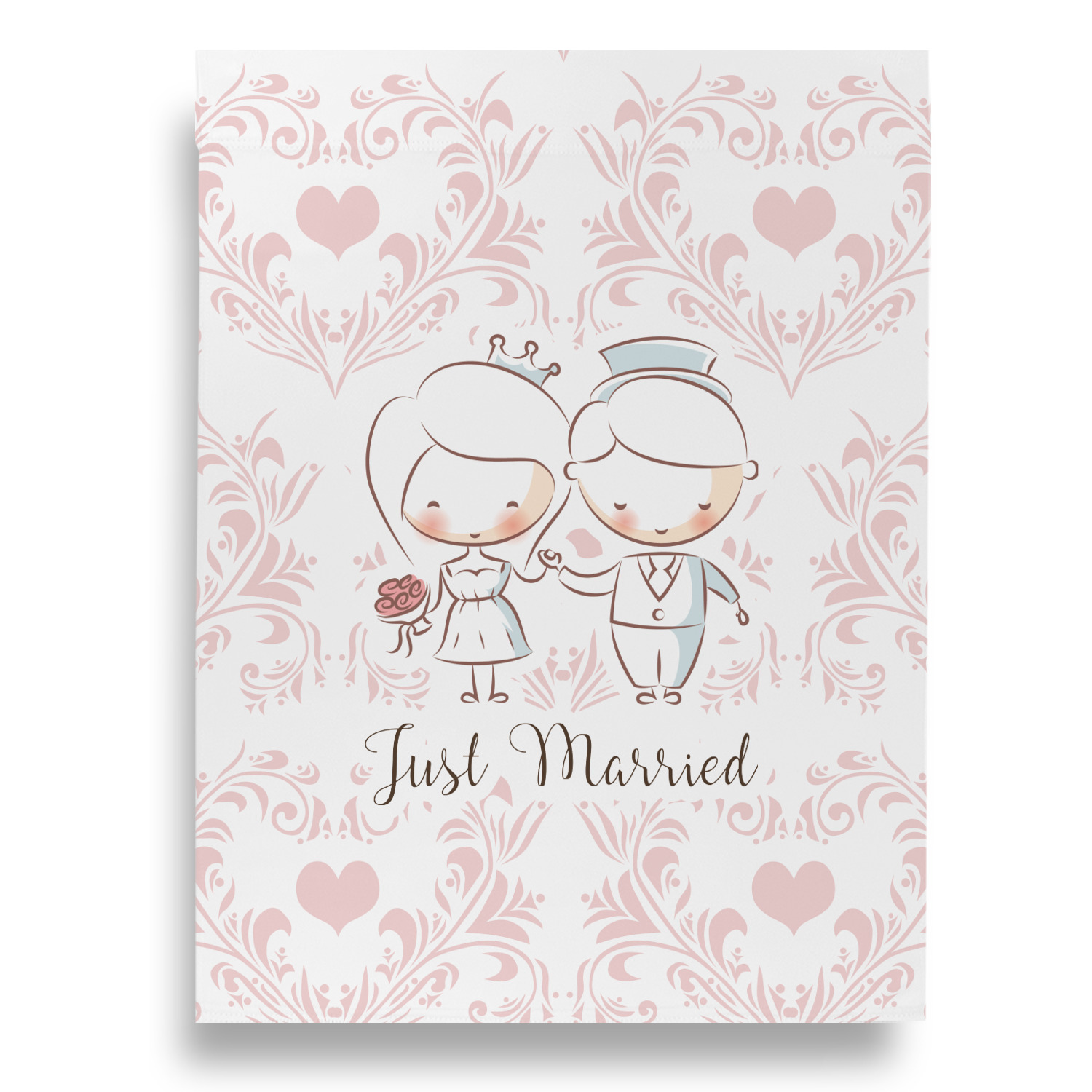 This design has an adorable bride and groom at the center of attention. They sit holding hands on a speckle textured off-white background. Above and below them is where the personalization goes, with the bride and groom's names and wedding date or whatever you choose. The textured background is a circle that surrounds the bride and groom while another background sits behind this circle. The secondary background is a white and light pink heart damask pattern, which looks adorable with the couples and their sweet rosy cheeks.
