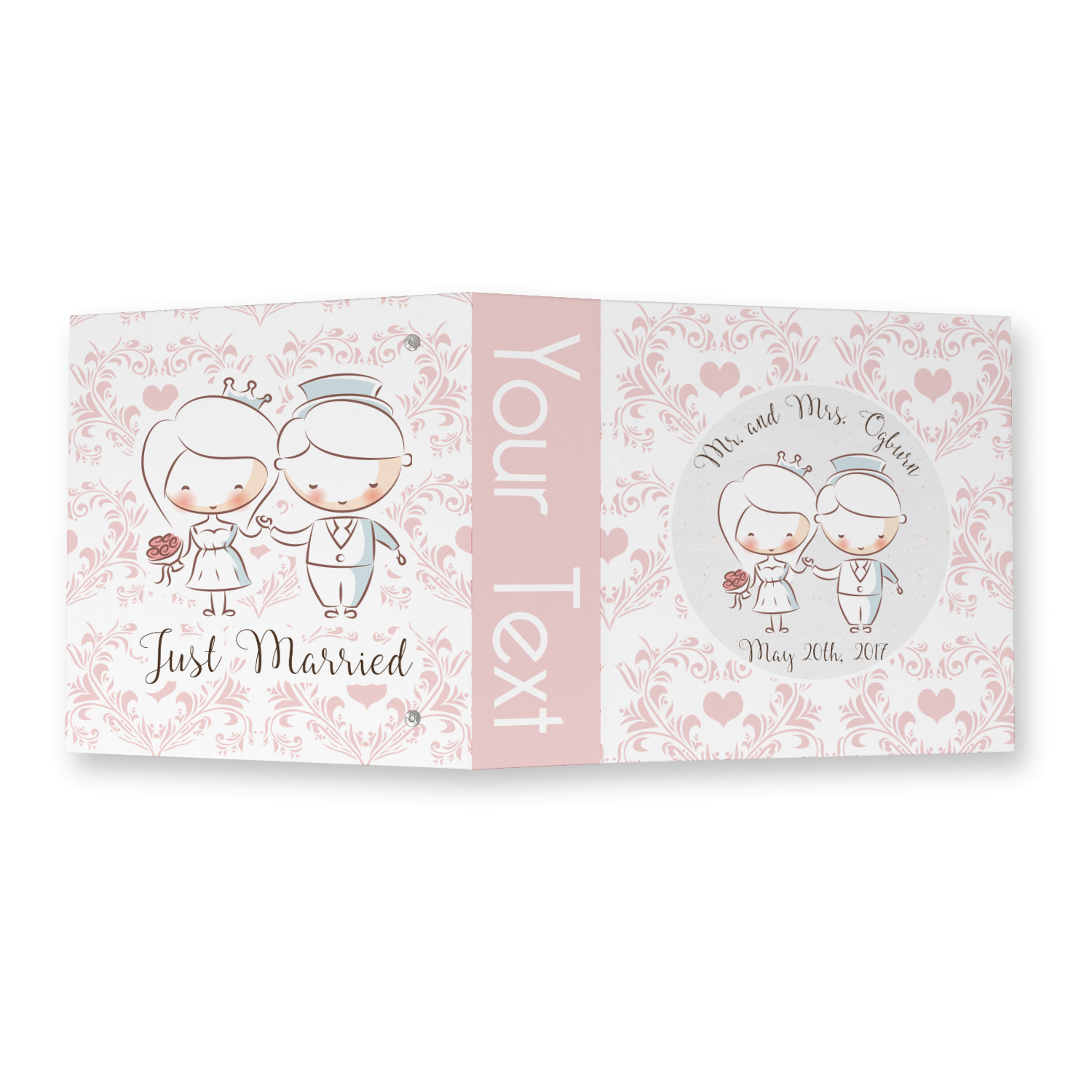 This design has an adorable bride and groom at the center of attention. They sit holding hands on a speckle textured off-white background. Above and below them is where the personalization goes, with the bride and groom's names and wedding date or whatever you choose. The textured background is a circle that surrounds the bride and groom while another background sits behind this circle. The secondary background is a white and light pink heart damask pattern, which looks adorable with the couples and their sweet rosy cheeks.
