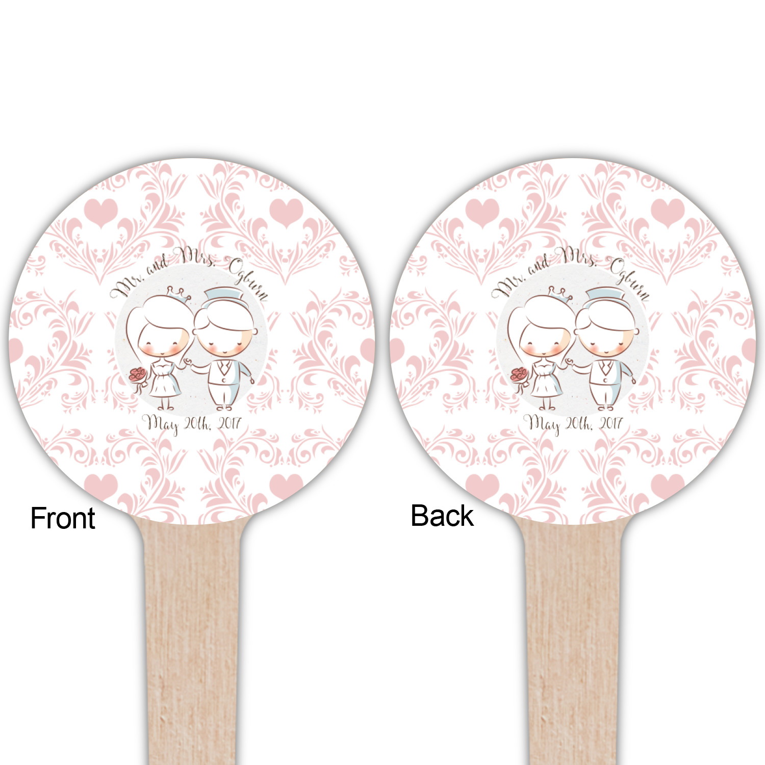 This design has an adorable bride and groom at the center of attention. They sit holding hands on a speckle textured off-white background. Above and below them is where the personalization goes, with the bride and groom's names and wedding date or whatever you choose. The textured background is a circle that surrounds the bride and groom while another background sits behind this circle. The secondary background is a white and light pink heart damask pattern, which looks adorable with the couples and their sweet rosy cheeks.