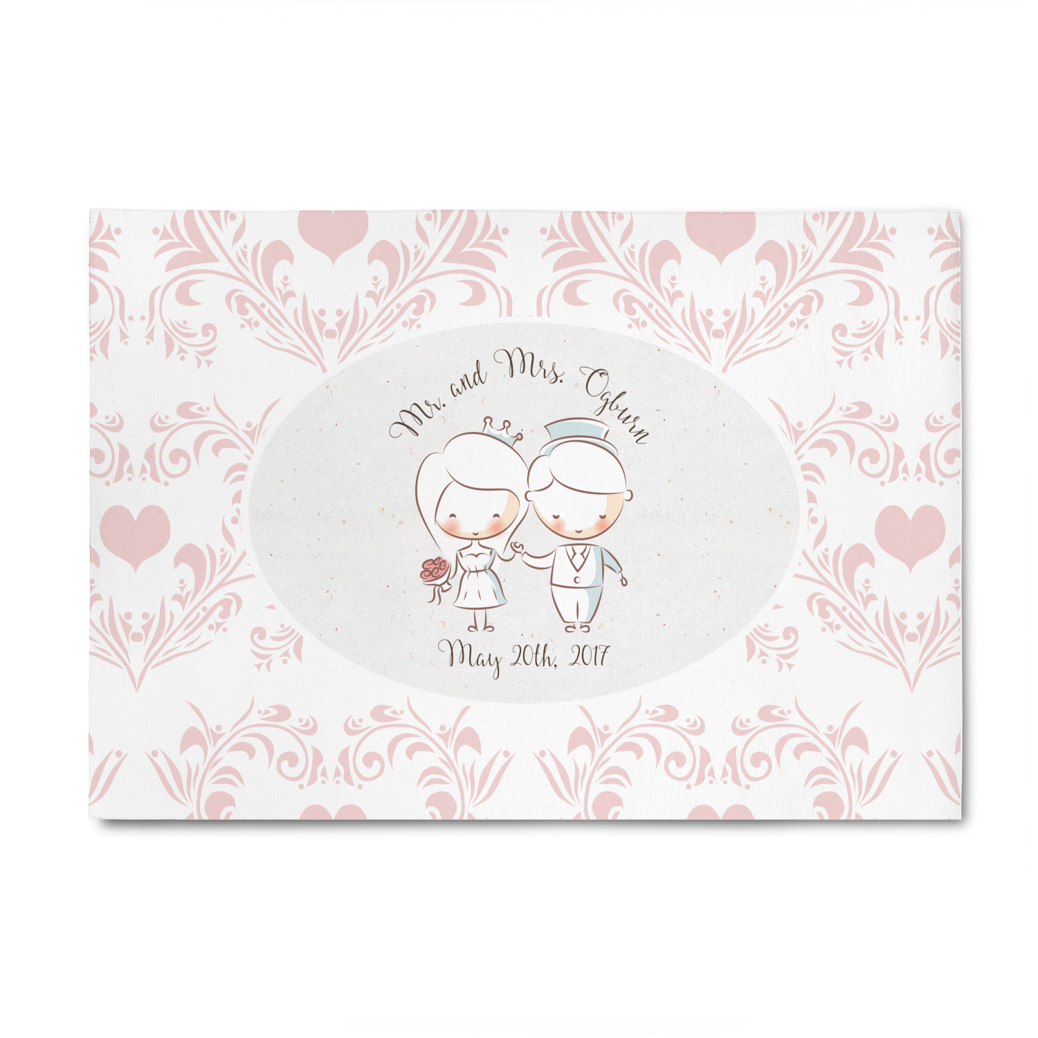 This design has an adorable bride and groom at the center of attention. They sit holding hands on a speckle textured off-white background. Above and below them is where the personalization goes, with the bride and groom's names and wedding date or whatever you choose. The textured background is a circle that surrounds the bride and groom while another background sits behind this circle. The secondary background is a white and light pink heart damask pattern, which looks adorable with the couples and their sweet rosy cheeks.
