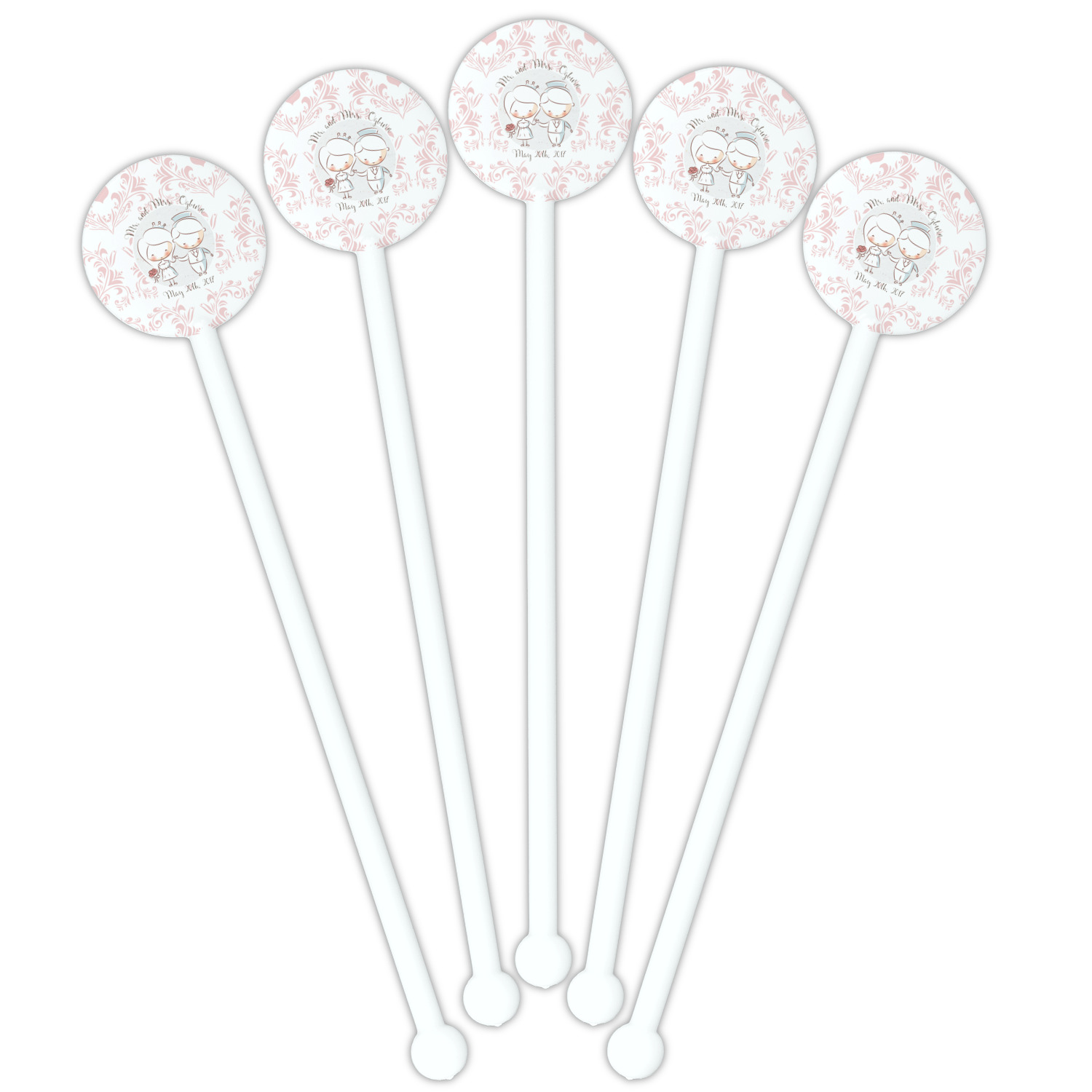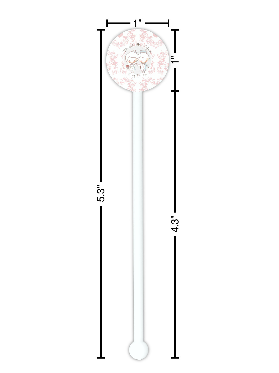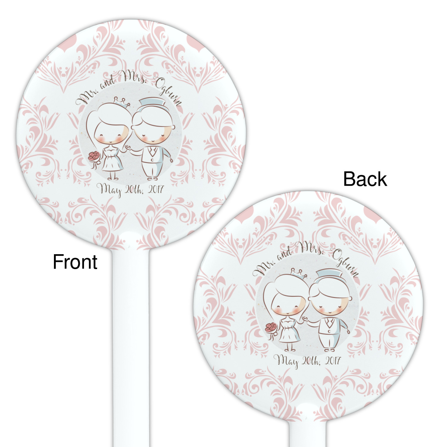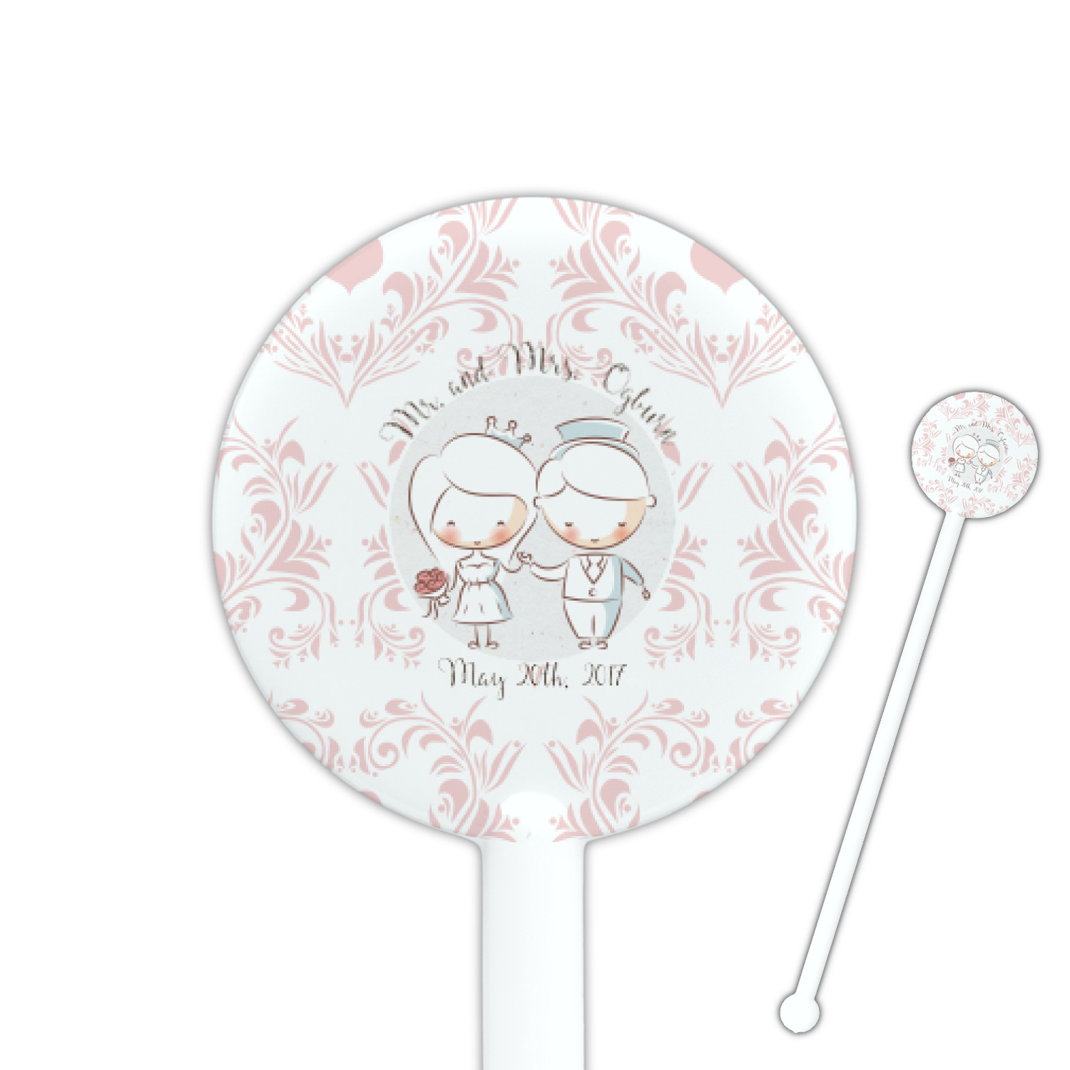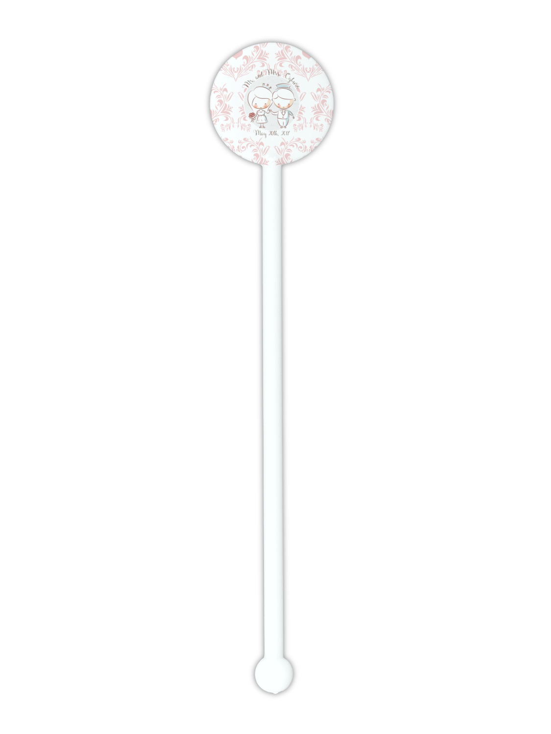 This design has an adorable bride and groom at the center of attention. They sit holding hands on a speckle textured off-white background. Above and below them is where the personalization goes, with the bride and groom's names and wedding date or whatever you choose. The textured background is a circle that surrounds the bride and groom while another background sits behind this circle. The secondary background is a white and light pink heart damask pattern, which looks adorable with the couples and their sweet rosy cheeks.