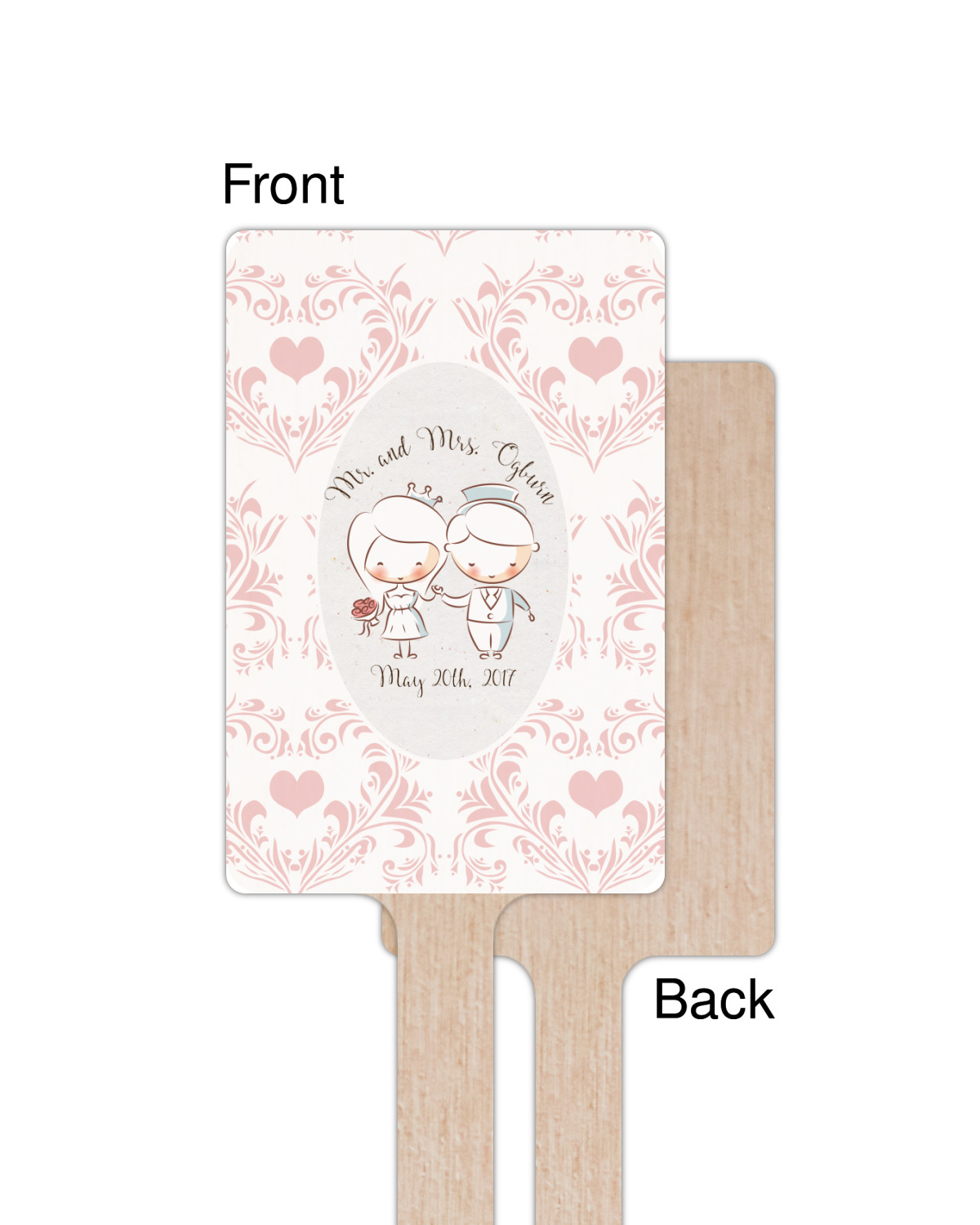 This design has an adorable bride and groom at the center of attention. They sit holding hands on a speckle textured off-white background. Above and below them is where the personalization goes, with the bride and groom's names and wedding date or whatever you choose. The textured background is a circle that surrounds the bride and groom while another background sits behind this circle. The secondary background is a white and light pink heart damask pattern, which looks adorable with the couples and their sweet rosy cheeks.