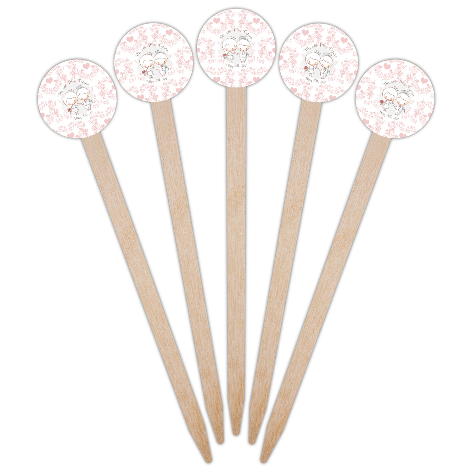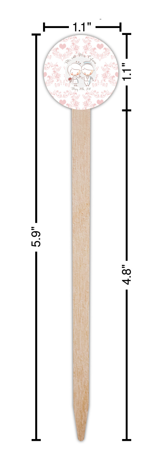 This design has an adorable bride and groom at the center of attention. They sit holding hands on a speckle textured off-white background. Above and below them is where the personalization goes, with the bride and groom's names and wedding date or whatever you choose. The textured background is a circle that surrounds the bride and groom while another background sits behind this circle. The secondary background is a white and light pink heart damask pattern, which looks adorable with the couples and their sweet rosy cheeks.