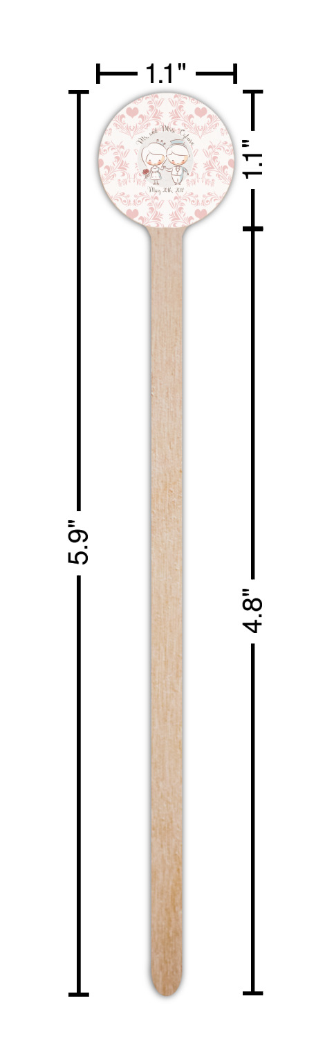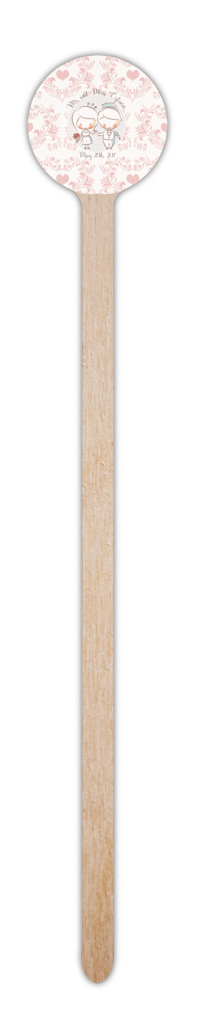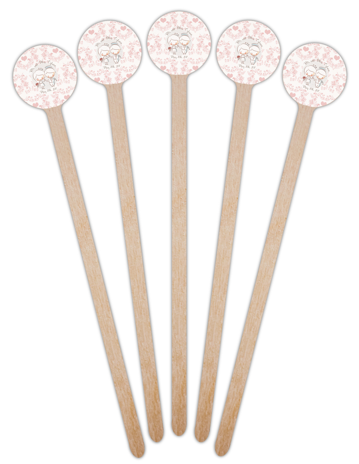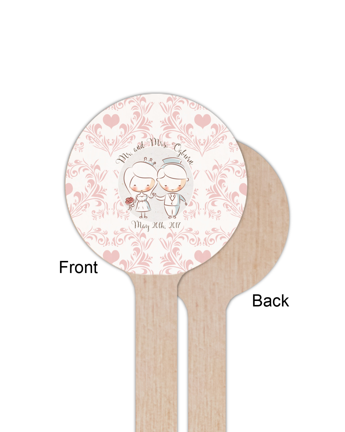 This design has an adorable bride and groom at the center of attention. They sit holding hands on a speckle textured off-white background. Above and below them is where the personalization goes, with the bride and groom's names and wedding date or whatever you choose. The textured background is a circle that surrounds the bride and groom while another background sits behind this circle. The secondary background is a white and light pink heart damask pattern, which looks adorable with the couples and their sweet rosy cheeks.