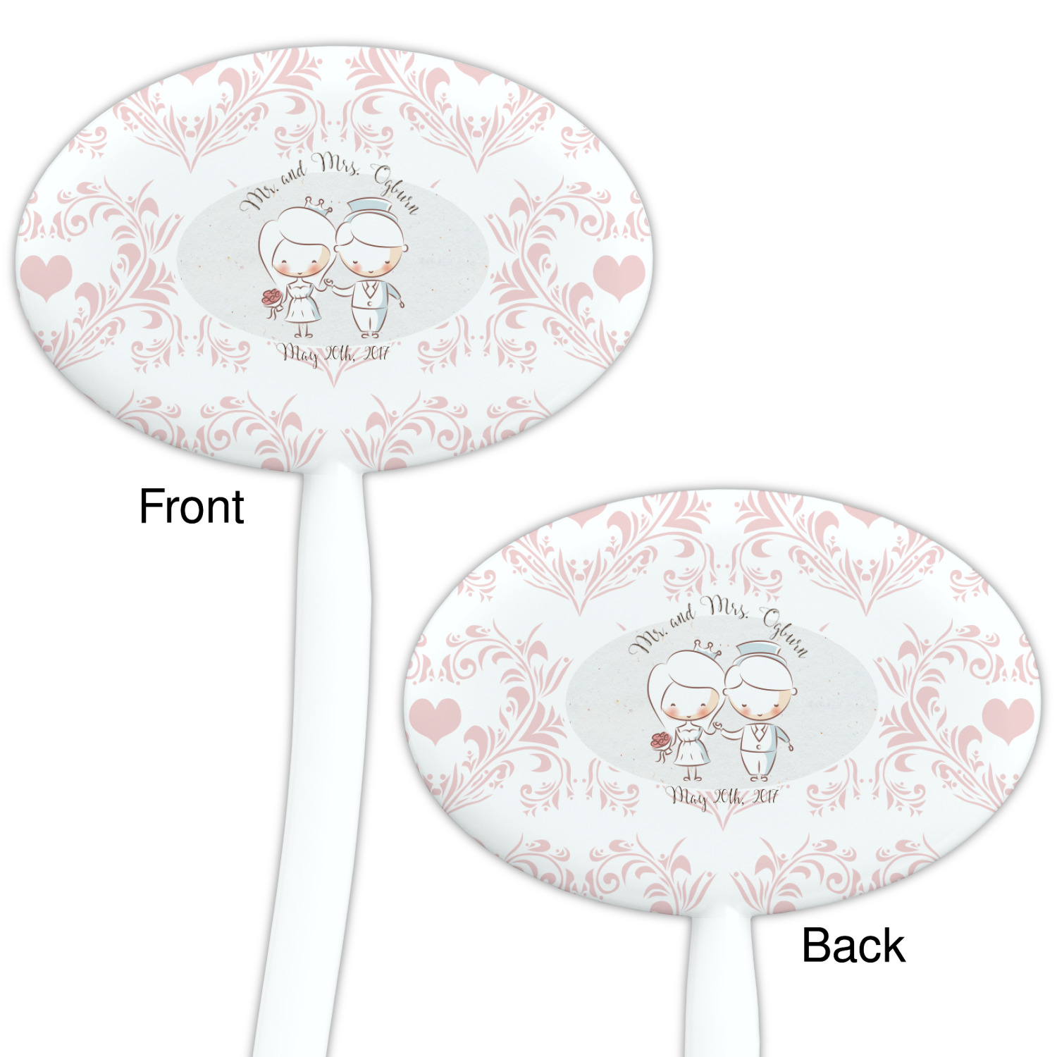 This design has an adorable bride and groom at the center of attention. They sit holding hands on a speckle textured off-white background. Above and below them is where the personalization goes, with the bride and groom's names and wedding date or whatever you choose. The textured background is a circle that surrounds the bride and groom while another background sits behind this circle. The secondary background is a white and light pink heart damask pattern, which looks adorable with the couples and their sweet rosy cheeks.