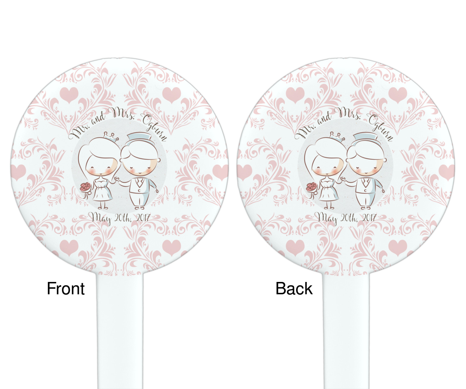 This design has an adorable bride and groom at the center of attention. They sit holding hands on a speckle textured off-white background. Above and below them is where the personalization goes, with the bride and groom's names and wedding date or whatever you choose. The textured background is a circle that surrounds the bride and groom while another background sits behind this circle. The secondary background is a white and light pink heart damask pattern, which looks adorable with the couples and their sweet rosy cheeks.