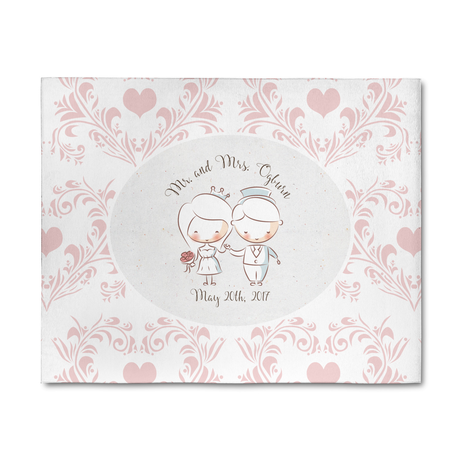 This design has an adorable bride and groom at the center of attention. They sit holding hands on a speckle textured off-white background. Above and below them is where the personalization goes, with the bride and groom's names and wedding date or whatever you choose. The textured background is a circle that surrounds the bride and groom while another background sits behind this circle. The secondary background is a white and light pink heart damask pattern, which looks adorable with the couples and their sweet rosy cheeks.