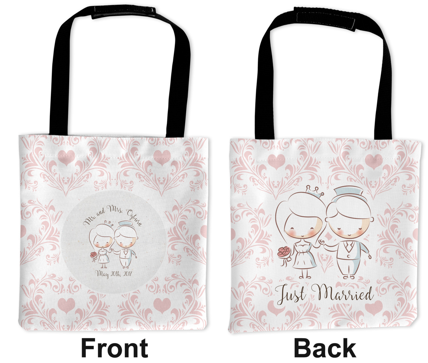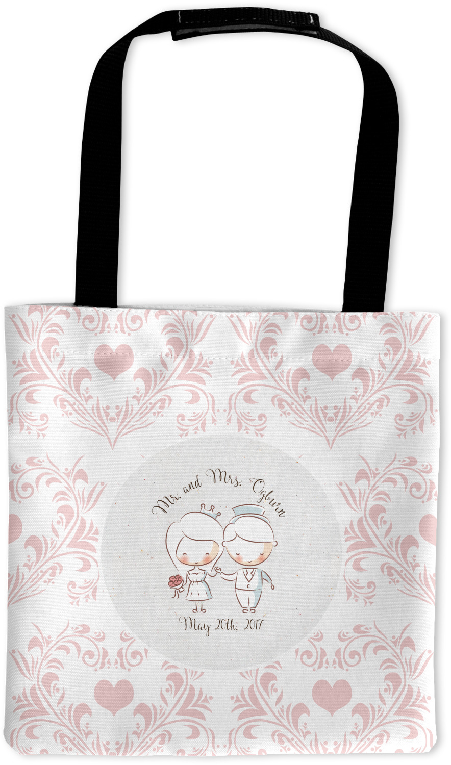 This design has an adorable bride and groom at the center of attention. They sit holding hands on a speckle textured off-white background. Above and below them is where the personalization goes, with the bride and groom's names and wedding date or whatever you choose. The textured background is a circle that surrounds the bride and groom while another background sits behind this circle. The secondary background is a white and light pink heart damask pattern, which looks adorable with the couples and their sweet rosy cheeks.