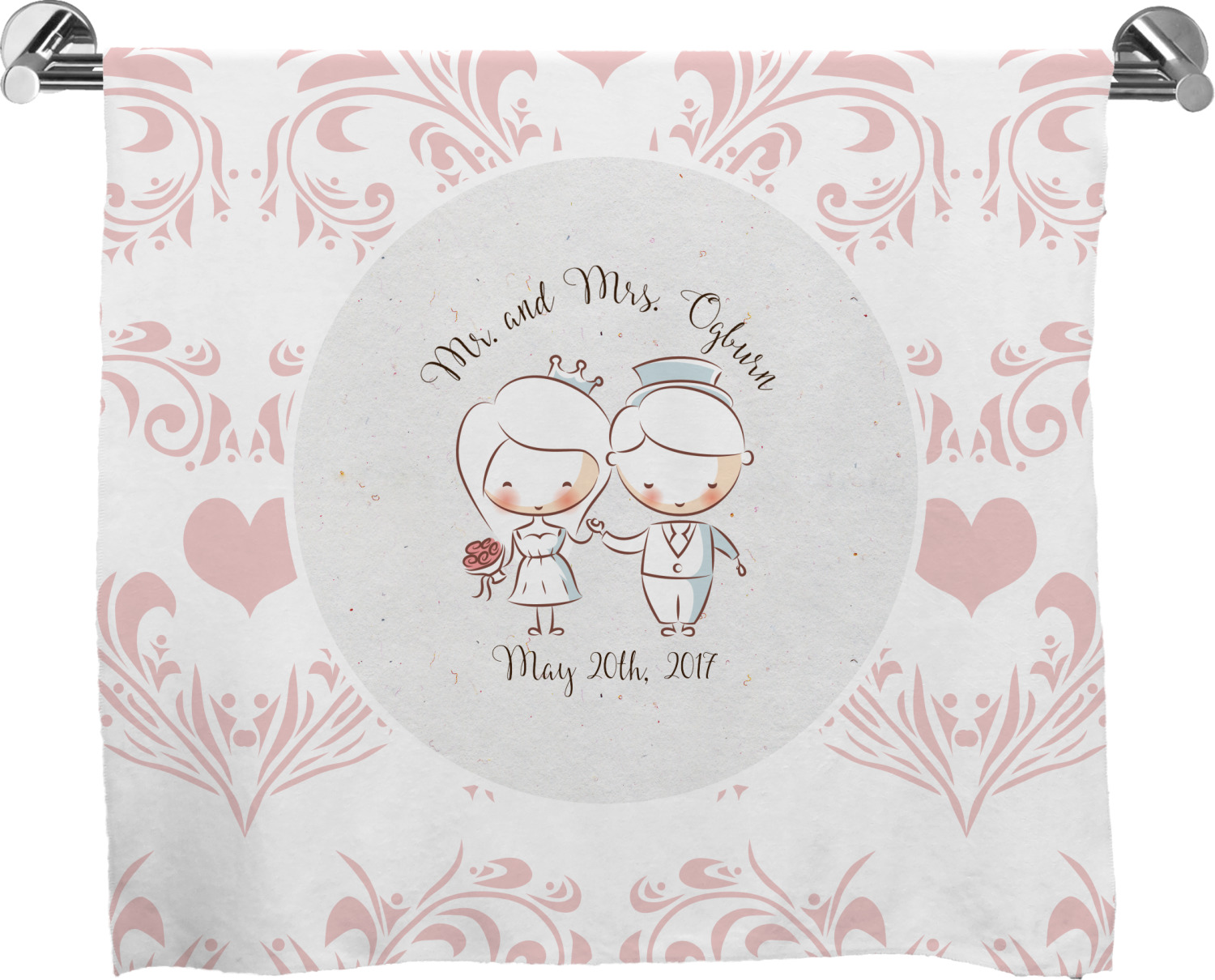 These customized bath towels are slightly larger than your standard towel and are the ideal size for wrapping around your body. They measure approximately 60" x 30". Your customization is displayed across the entire front face of the towel, while the back is white.