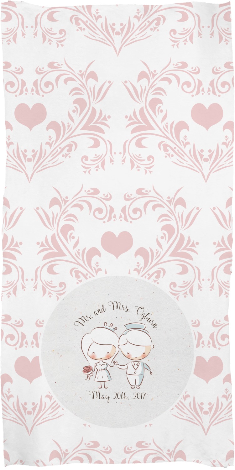 This design has an adorable bride and groom at the center of attention. They sit holding hands on a speckle textured off-white background. Above and below them is where the personalization goes, with the bride and groom's names and wedding date or whatever you choose. The textured background is a circle that surrounds the bride and groom while another background sits behind this circle. The secondary background is a white and light pink heart damask pattern, which looks adorable with the couples and their sweet rosy cheeks.