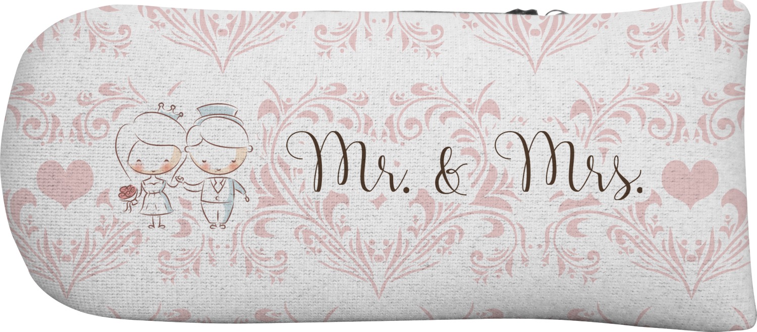 This design has an adorable bride and groom at the center of attention. They sit holding hands on a speckle textured off-white background. Above and below them is where the personalization goes, with the bride and groom's names and wedding date or whatever you choose. The textured background is a circle that surrounds the bride and groom while another background sits behind this circle. The secondary background is a white and light pink heart damask pattern, which looks adorable with the couples and their sweet rosy cheeks.