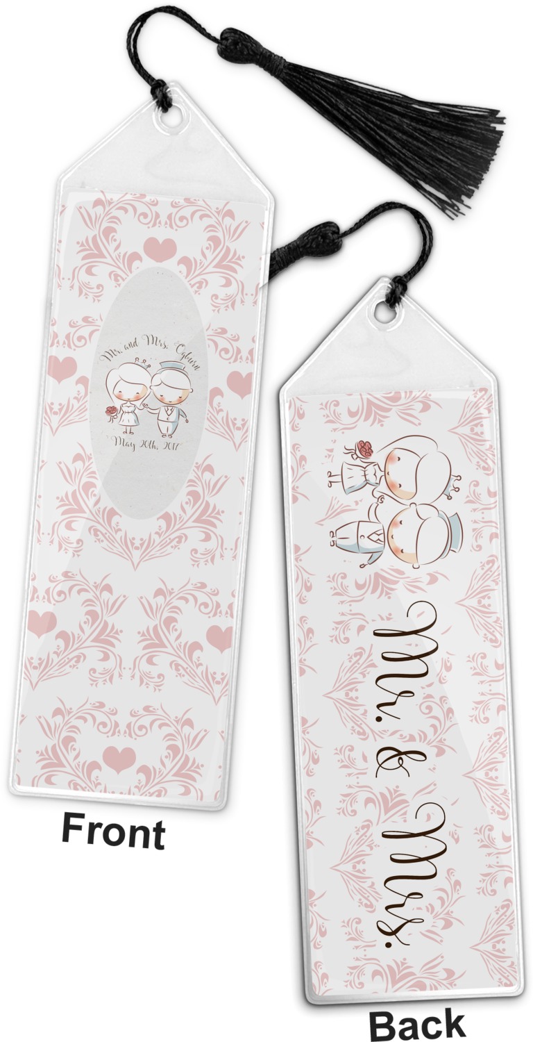 Your personalized bookmark is made of a sturdy, clear vinyl, and is approximately 7.5" x 2.25". We display your personalization on vinyl inserts that are placed on both sides. Accompanying each book marker is a black, fringe tassel that attaches to the reinforced, triangular header.