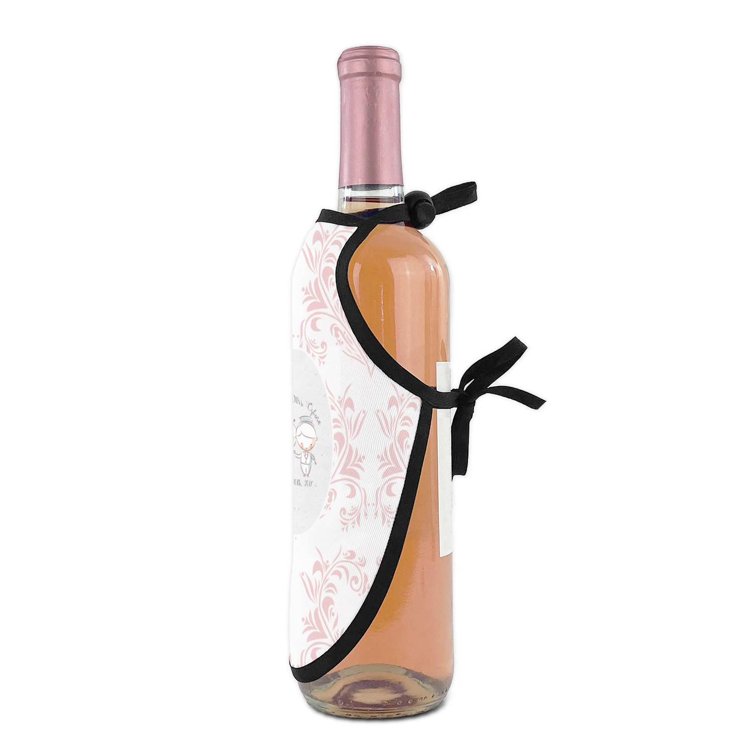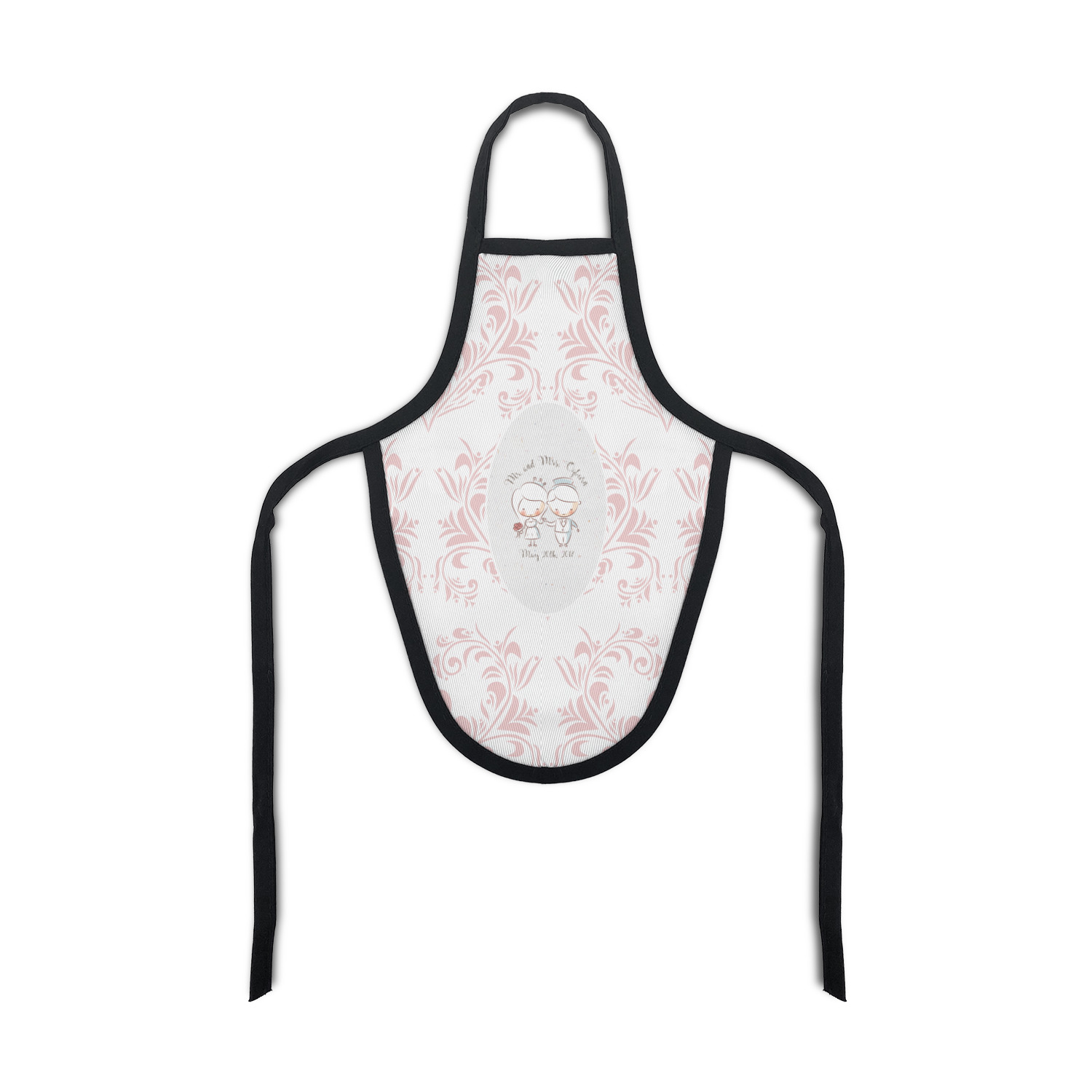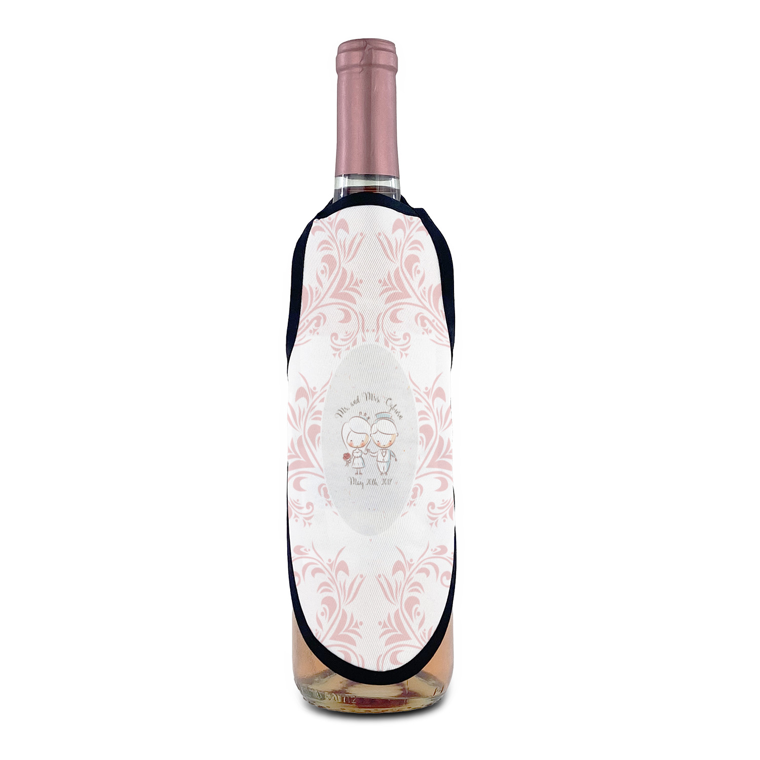 This design has an adorable bride and groom at the center of attention. They sit holding hands on a speckle textured off-white background. Above and below them is where the personalization goes, with the bride and groom's names and wedding date or whatever you choose. The textured background is a circle that surrounds the bride and groom while another background sits behind this circle. The secondary background is a white and light pink heart damask pattern, which looks adorable with the couples and their sweet rosy cheeks.