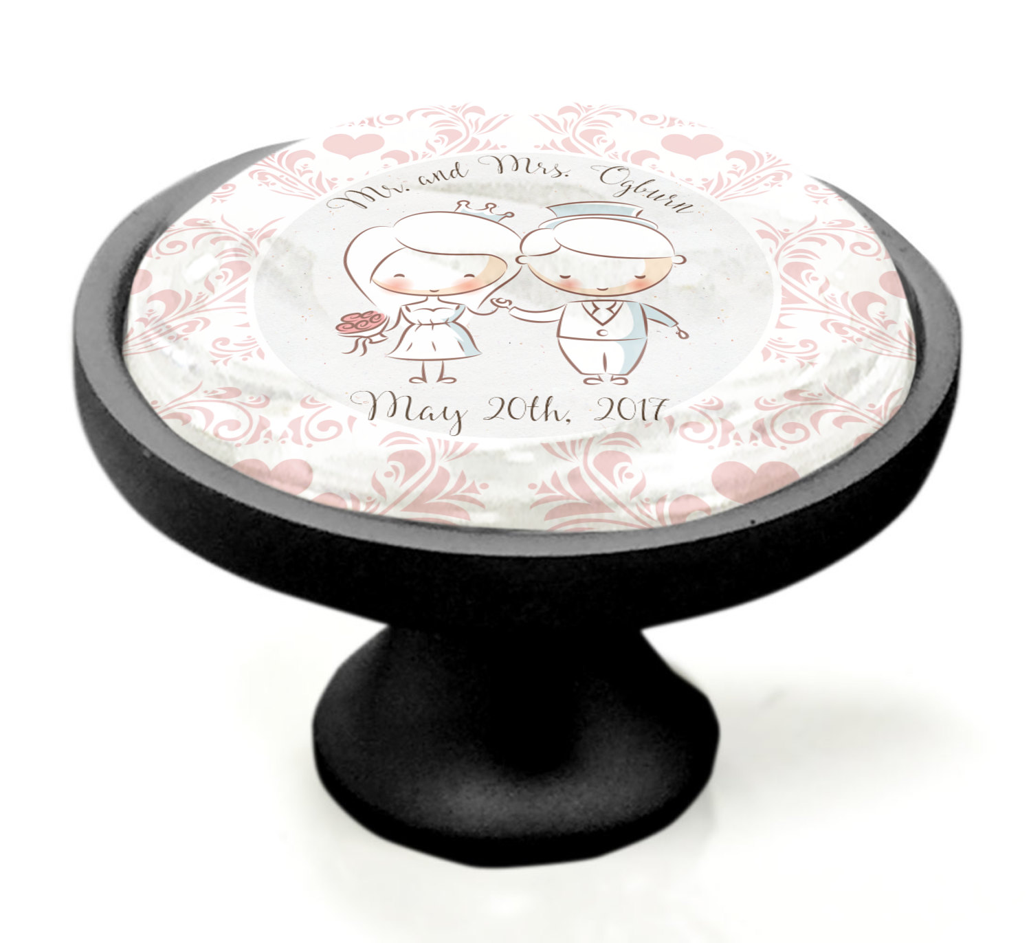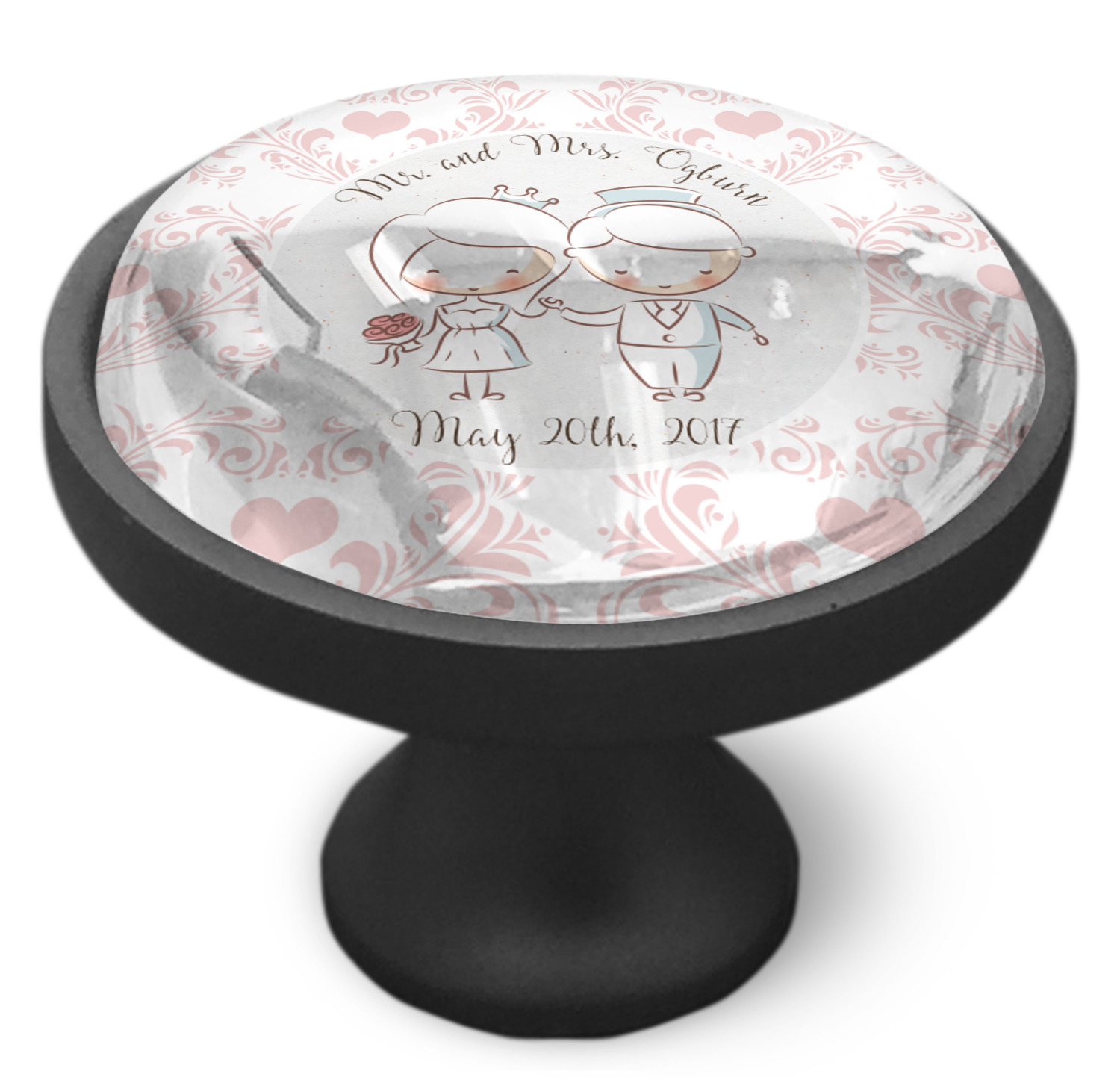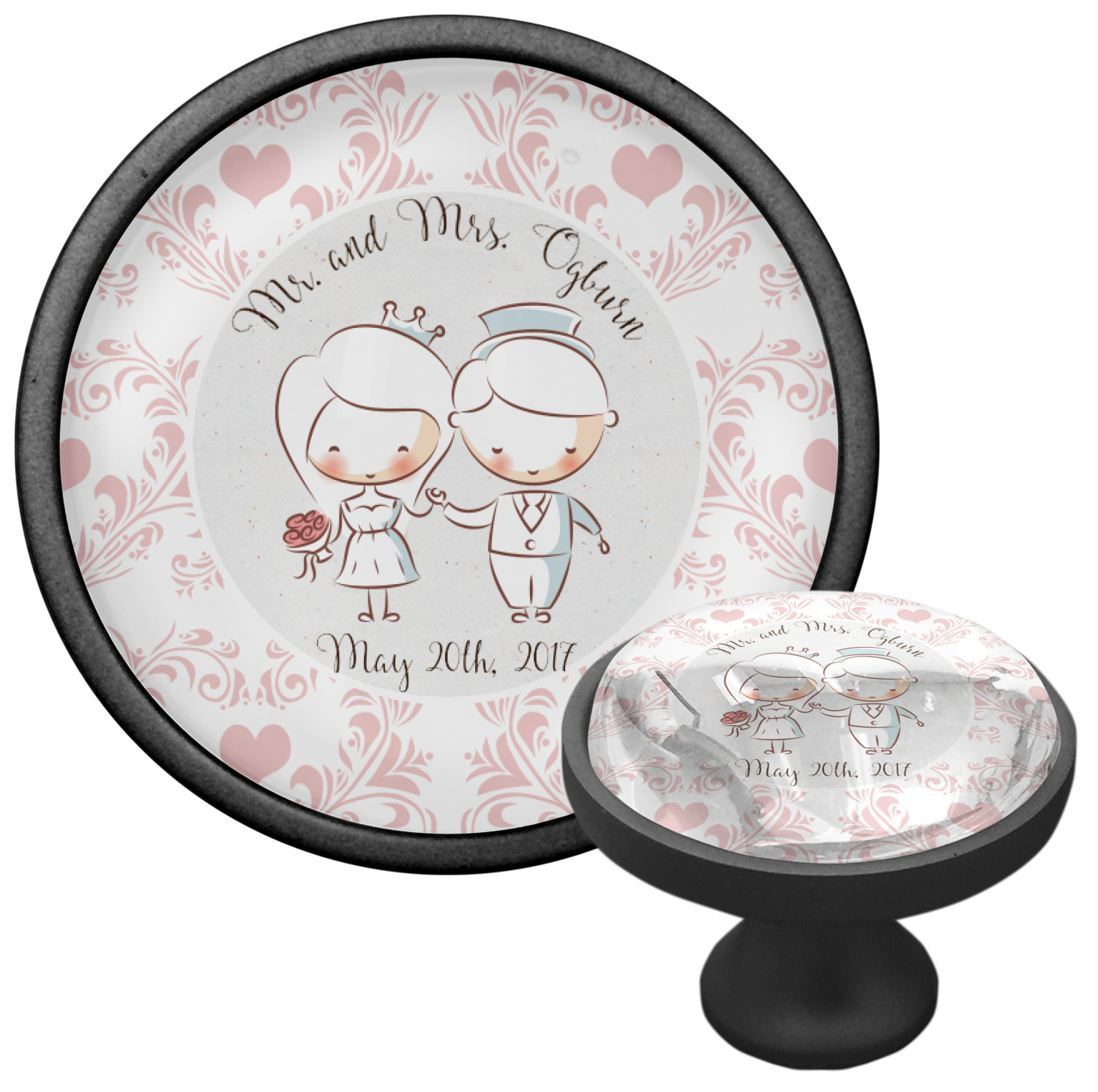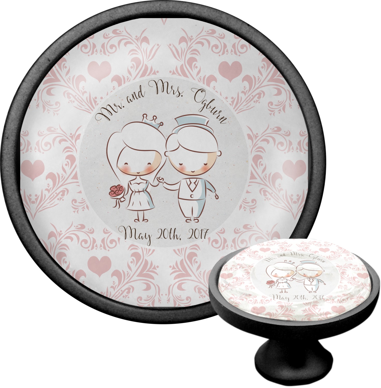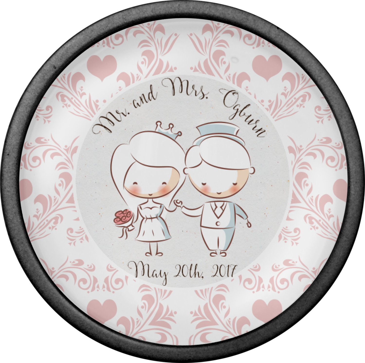 This design has an adorable bride and groom at the center of attention. They sit holding hands on a speckle textured off-white background. Above and below them is where the personalization goes, with the bride and groom's names and wedding date or whatever you choose. The textured background is a circle that surrounds the bride and groom while another background sits behind this circle. The secondary background is a white and light pink heart damask pattern, which looks adorable with the couples and their sweet rosy cheeks.