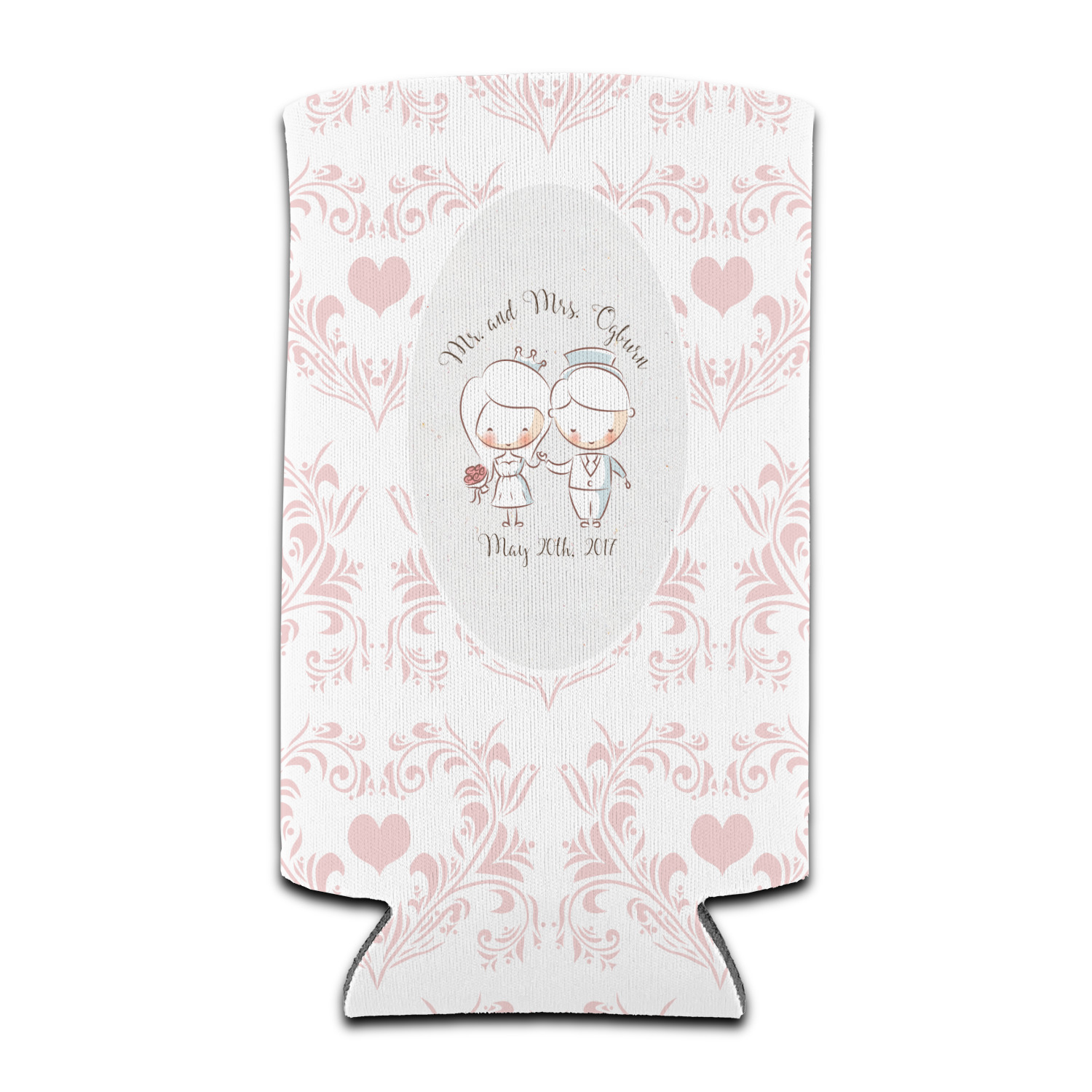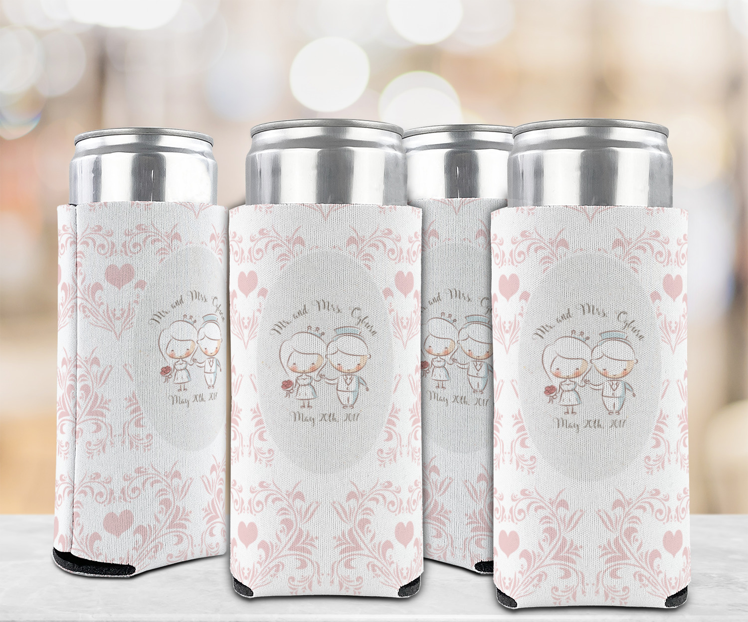 This design has an adorable bride and groom at the center of attention. They sit holding hands on a speckle textured off-white background. Above and below them is where the personalization goes, with the bride and groom's names and wedding date or whatever you choose. The textured background is a circle that surrounds the bride and groom while another background sits behind this circle. The secondary background is a white and light pink heart damask pattern, which looks adorable with the couples and their sweet rosy cheeks.