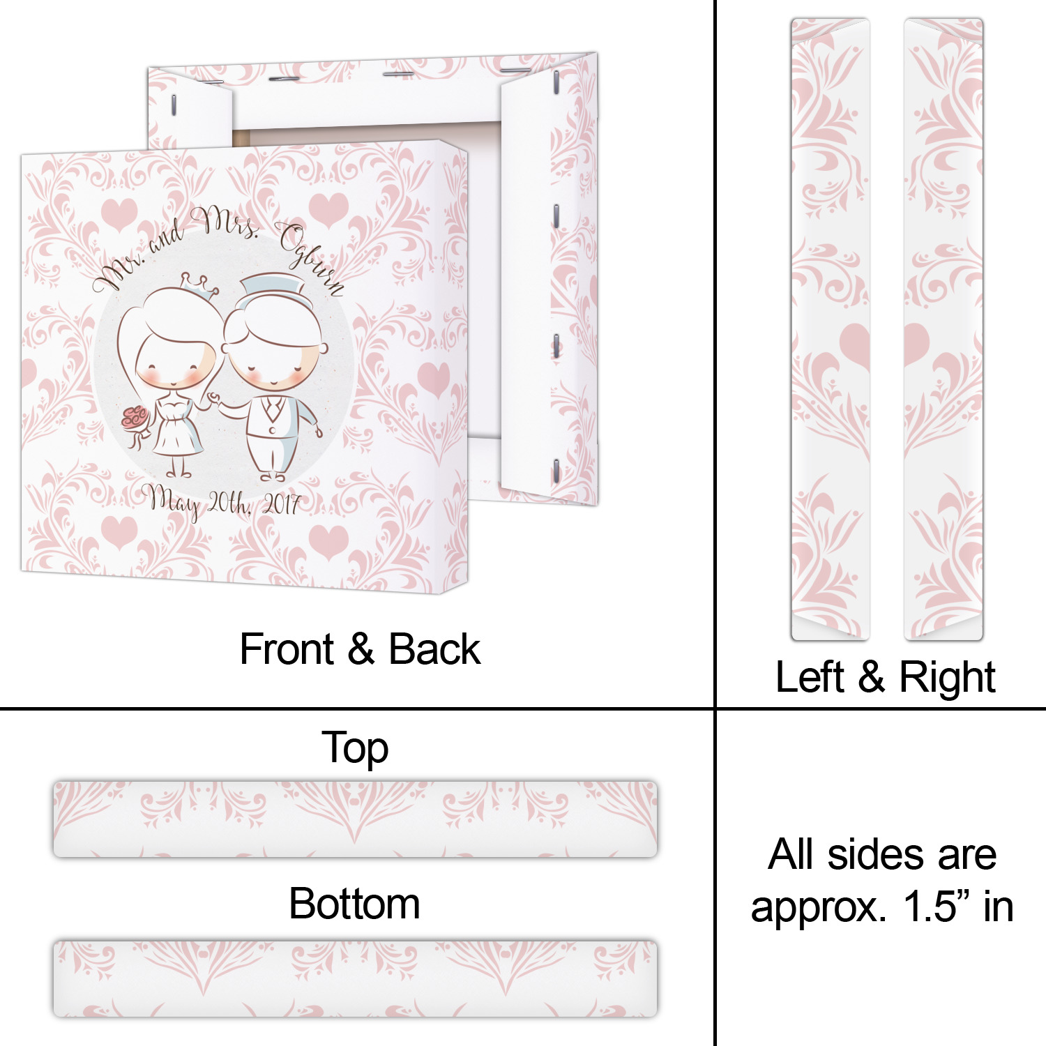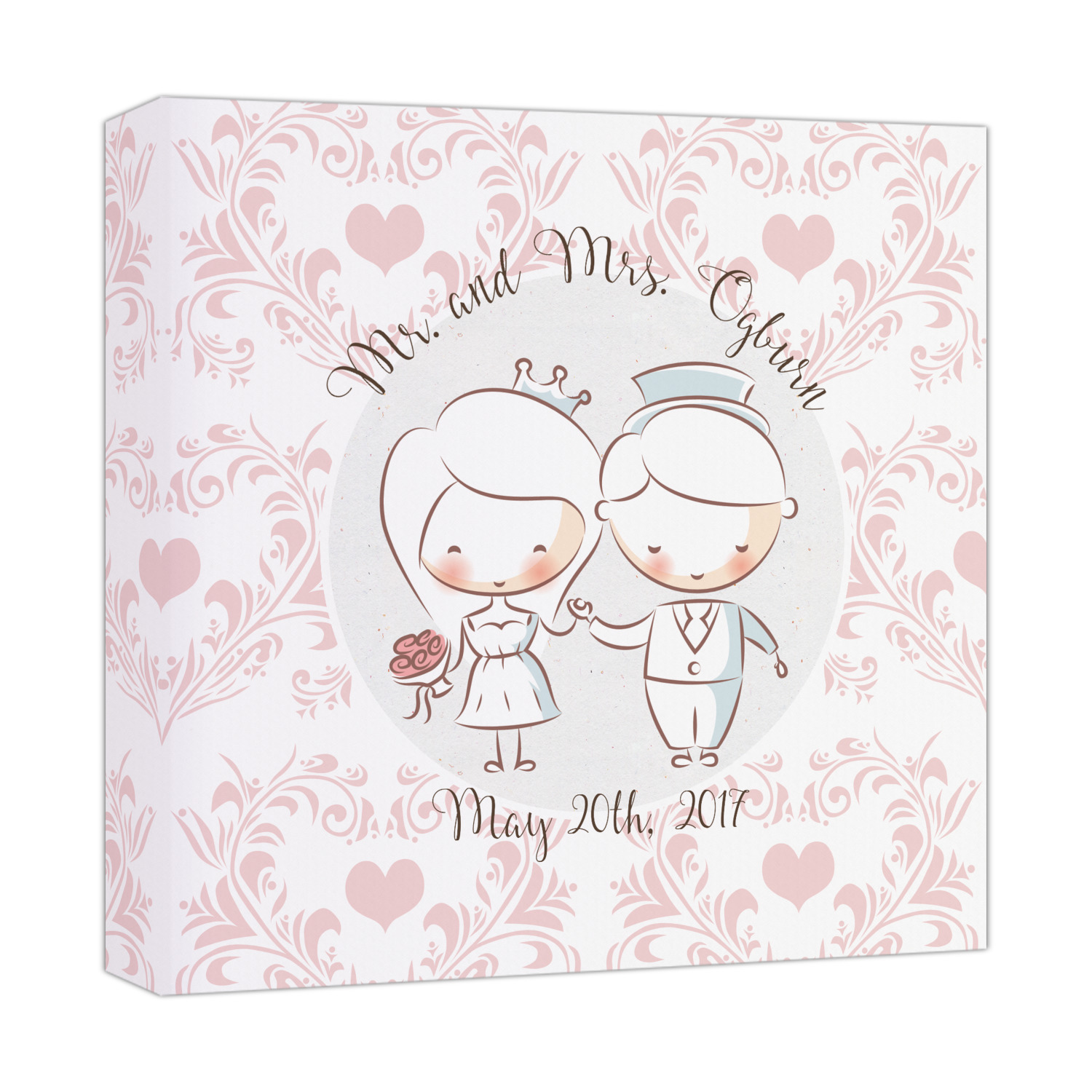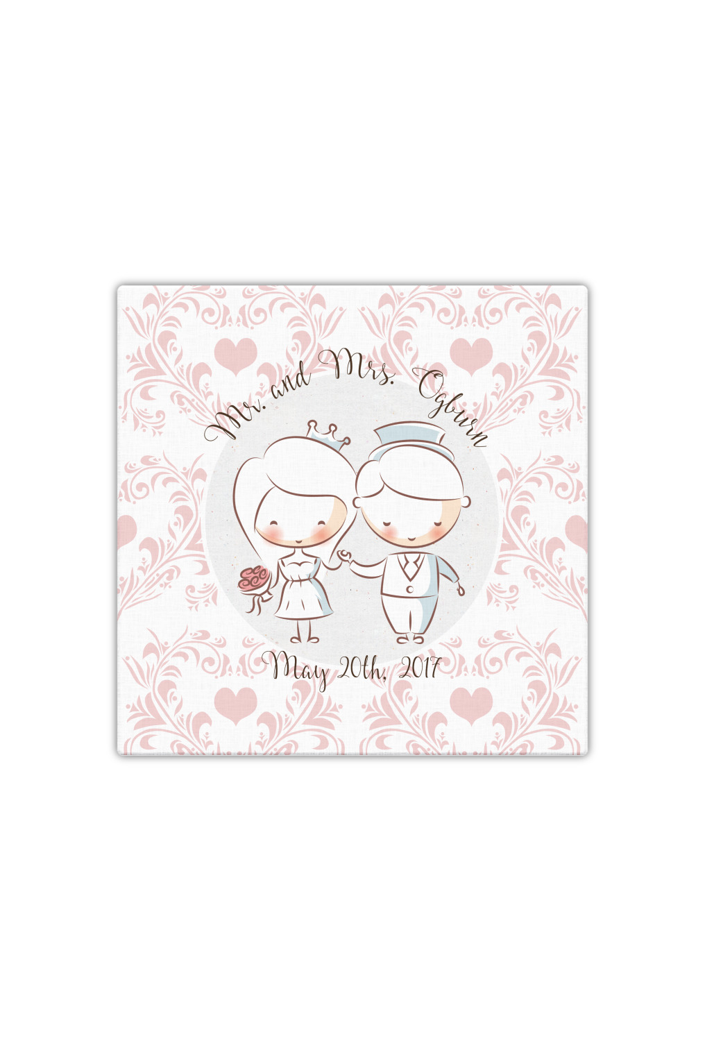 This design has an adorable bride and groom at the center of attention. They sit holding hands on a speckle textured off-white background. Above and below them is where the personalization goes, with the bride and groom's names and wedding date or whatever you choose. The textured background is a circle that surrounds the bride and groom while another background sits behind this circle. The secondary background is a white and light pink heart damask pattern, which looks adorable with the couples and their sweet rosy cheeks.