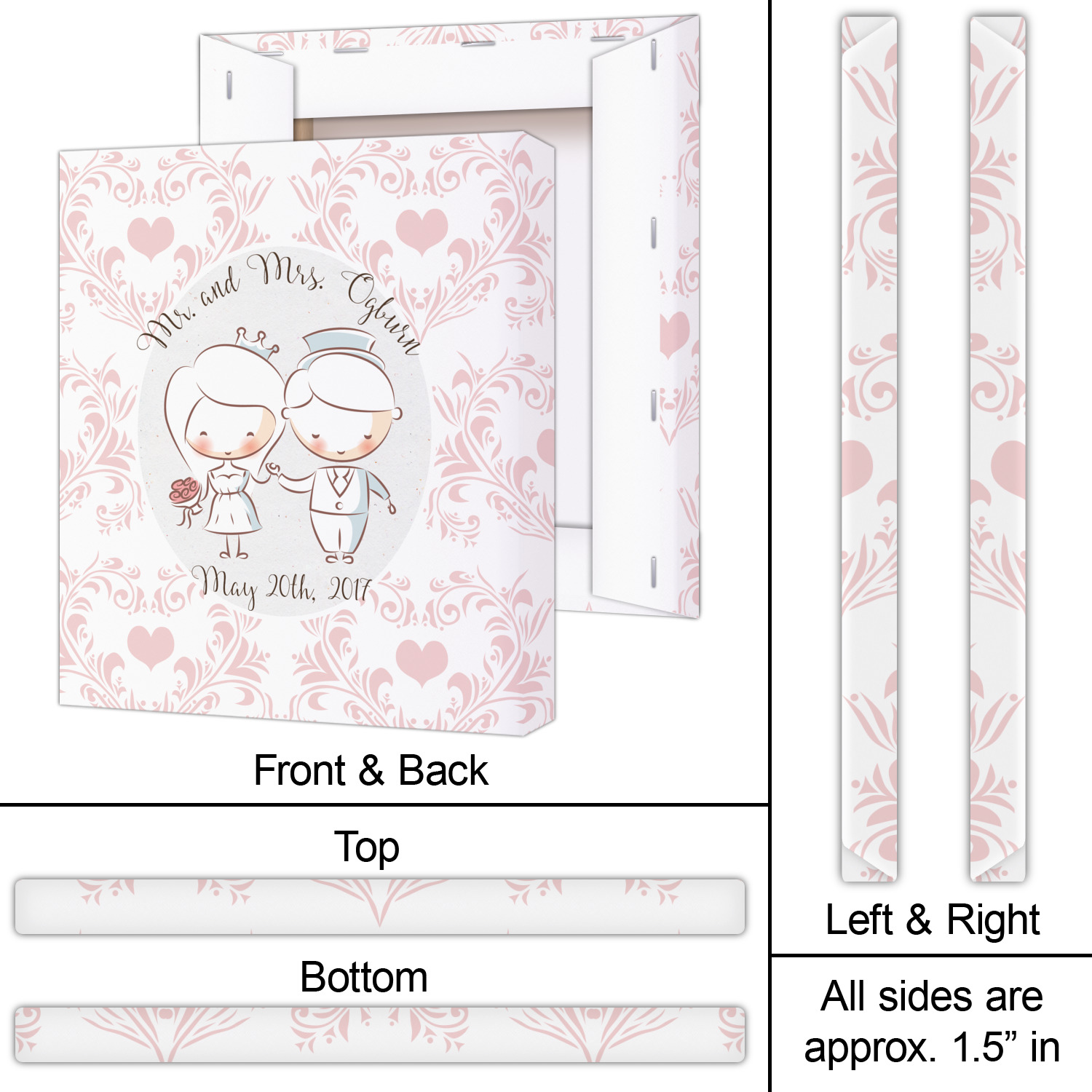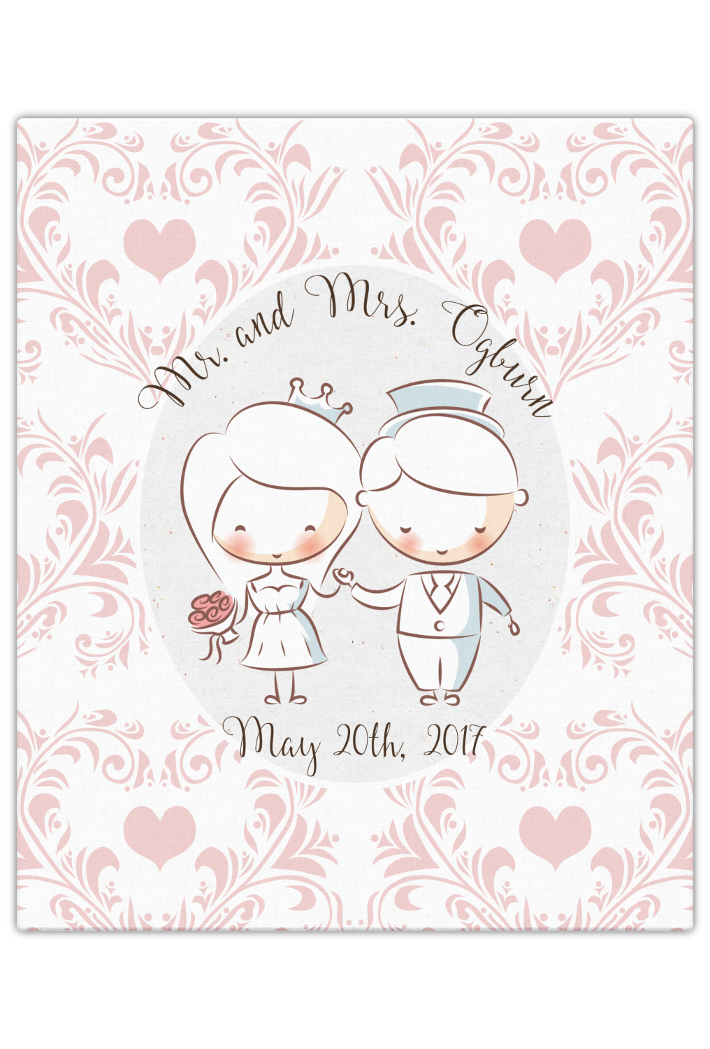 This design has an adorable bride and groom at the center of attention. They sit holding hands on a speckle textured off-white background. Above and below them is where the personalization goes, with the bride and groom's names and wedding date or whatever you choose. The textured background is a circle that surrounds the bride and groom while another background sits behind this circle. The secondary background is a white and light pink heart damask pattern, which looks adorable with the couples and their sweet rosy cheeks.