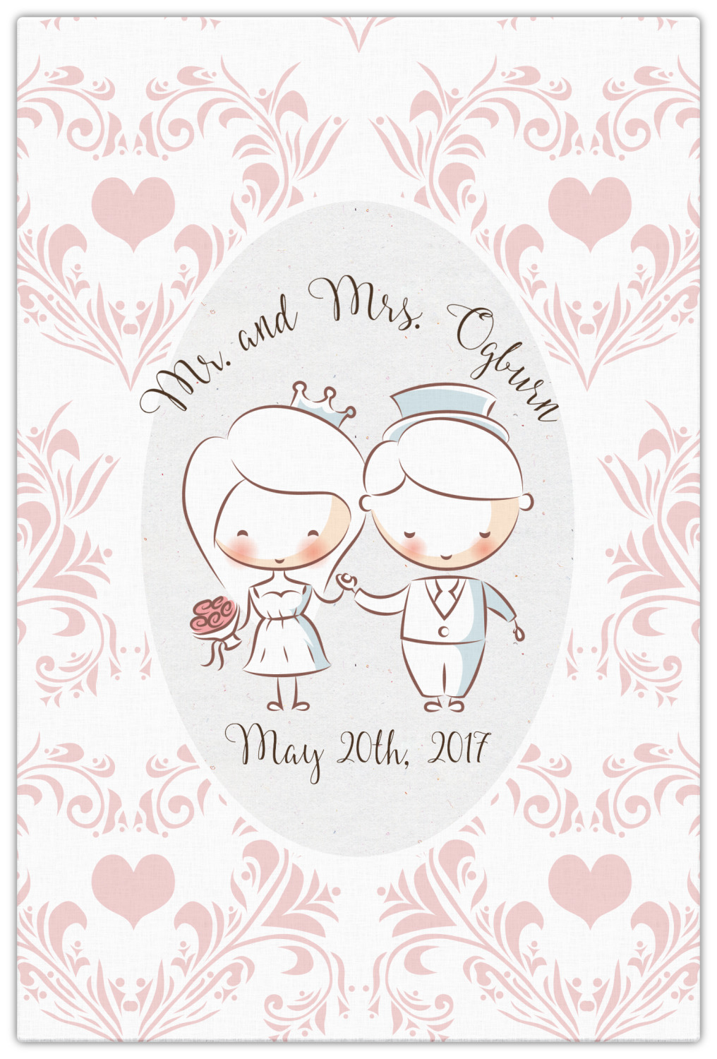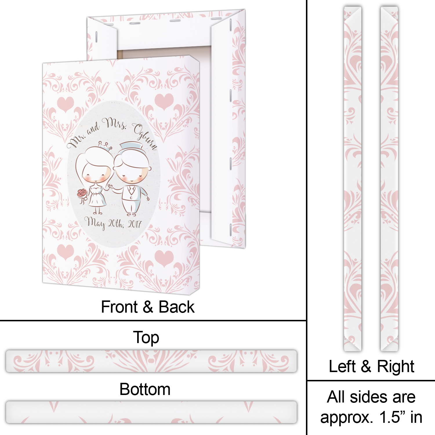 This design has an adorable bride and groom at the center of attention. They sit holding hands on a speckle textured off-white background. Above and below them is where the personalization goes, with the bride and groom's names and wedding date or whatever you choose. The textured background is a circle that surrounds the bride and groom while another background sits behind this circle. The secondary background is a white and light pink heart damask pattern, which looks adorable with the couples and their sweet rosy cheeks.
