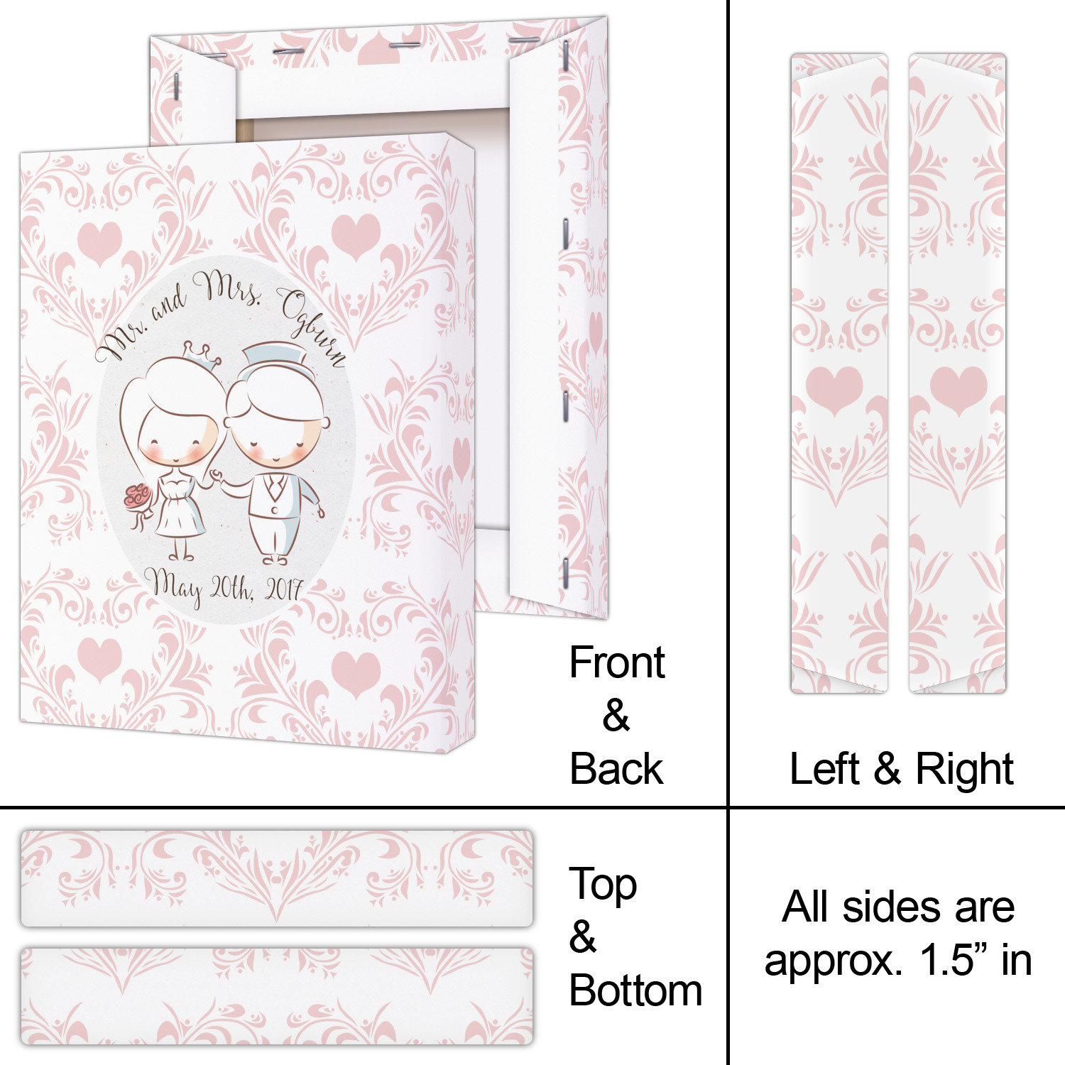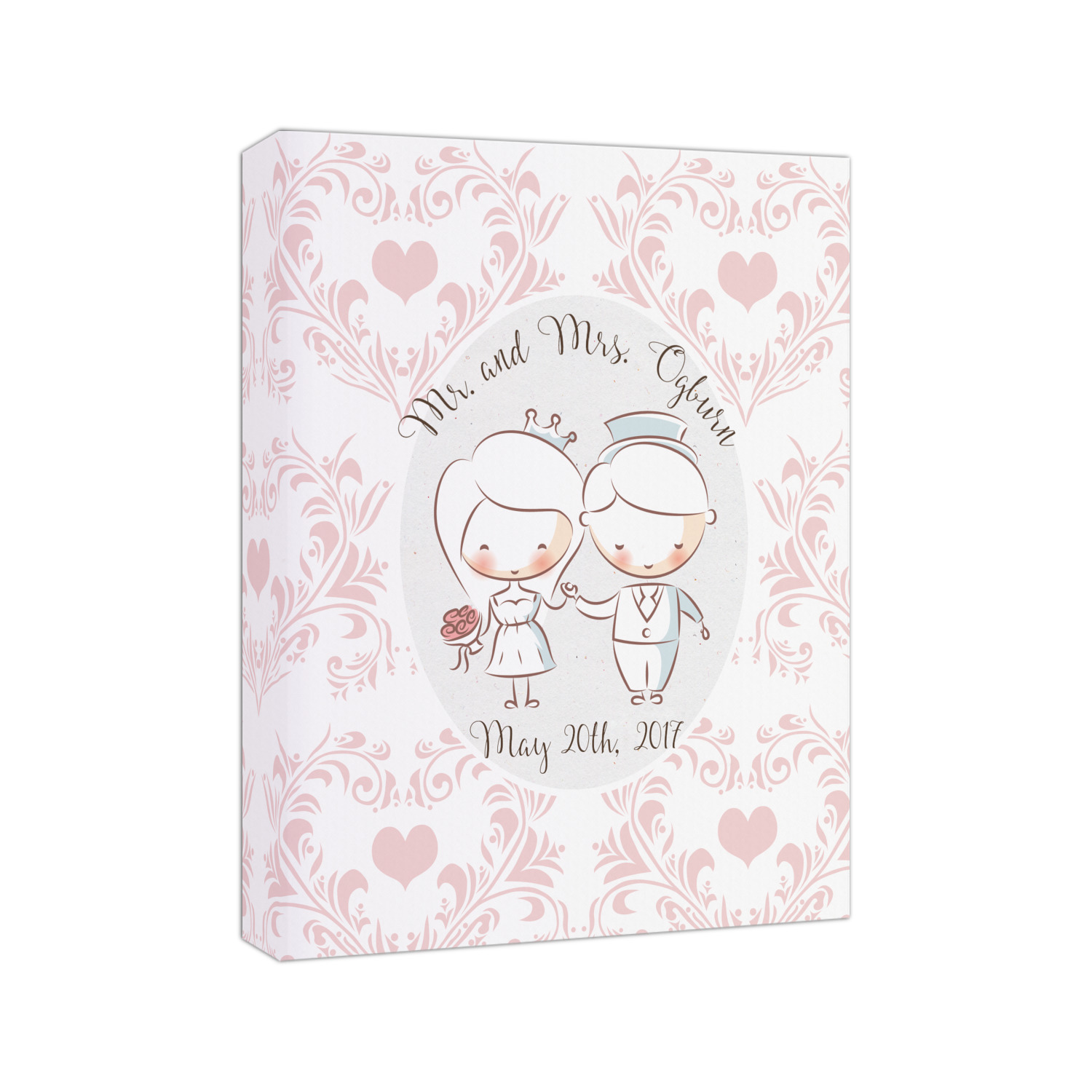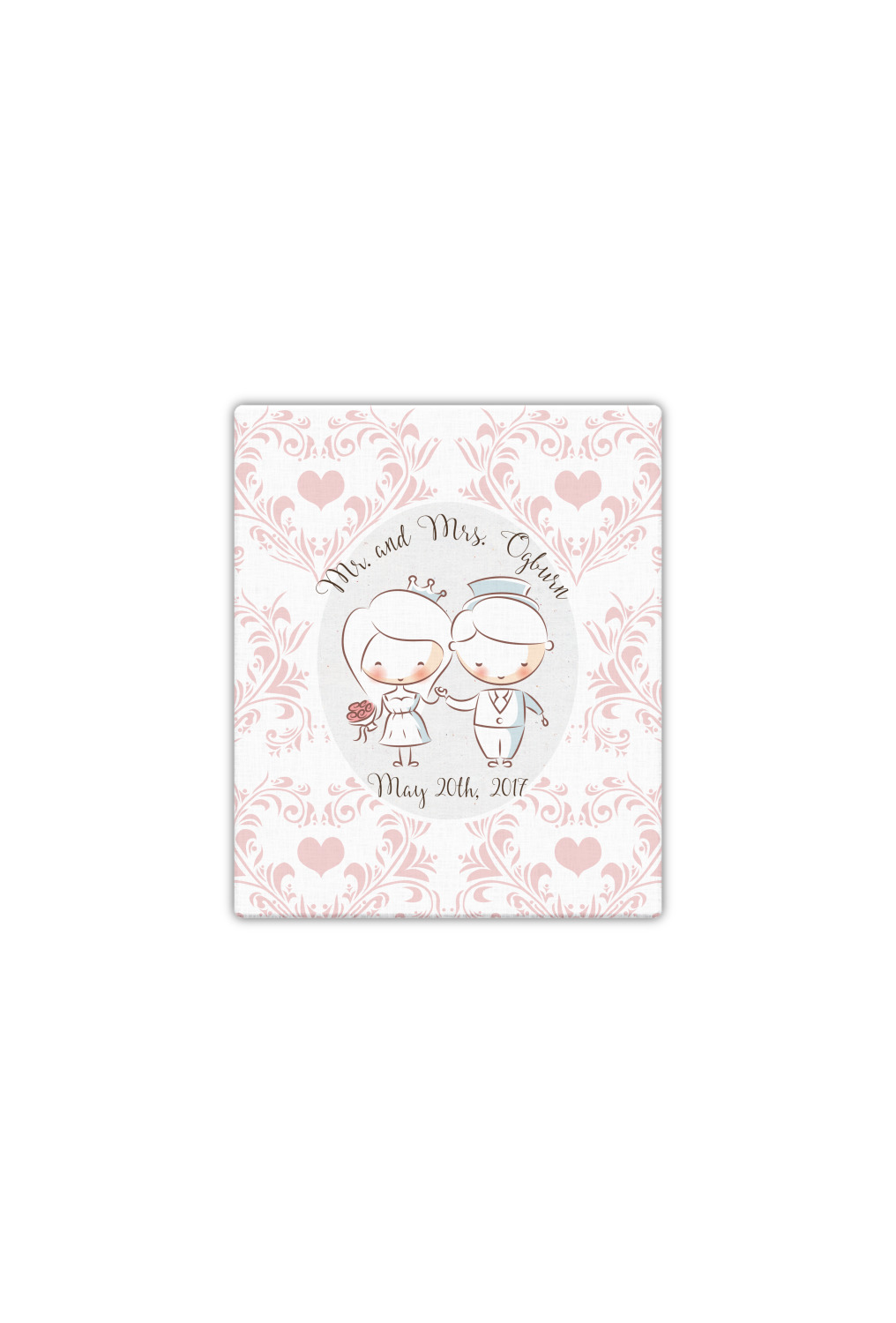 This design has an adorable bride and groom at the center of attention. They sit holding hands on a speckle textured off-white background. Above and below them is where the personalization goes, with the bride and groom's names and wedding date or whatever you choose. The textured background is a circle that surrounds the bride and groom while another background sits behind this circle. The secondary background is a white and light pink heart damask pattern, which looks adorable with the couples and their sweet rosy cheeks.