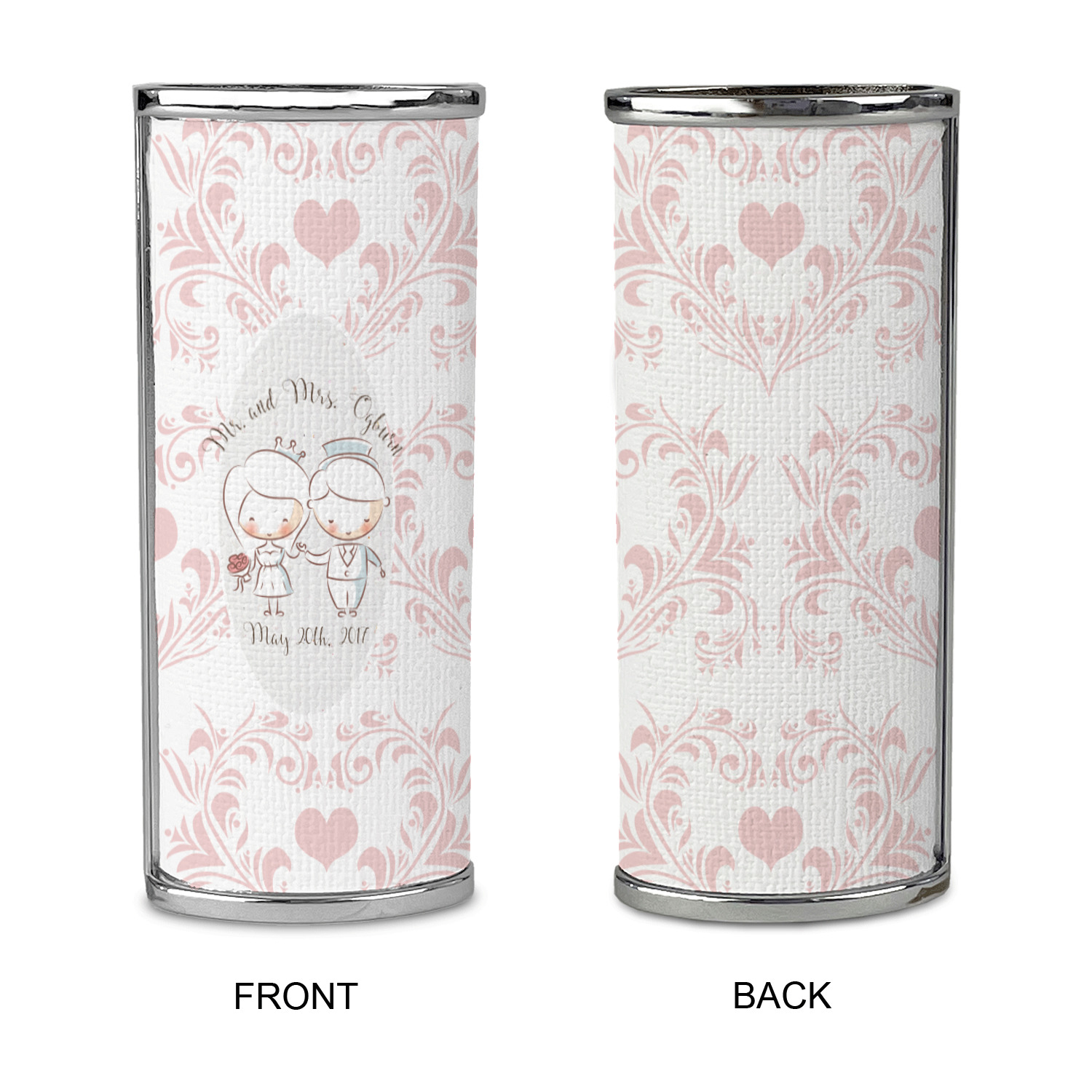 This design has an adorable bride and groom at the center of attention. They sit holding hands on a speckle textured off-white background. Above and below them is where the personalization goes, with the bride and groom's names and wedding date or whatever you choose. The textured background is a circle that surrounds the bride and groom while another background sits behind this circle. The secondary background is a white and light pink heart damask pattern, which looks adorable with the couples and their sweet rosy cheeks.