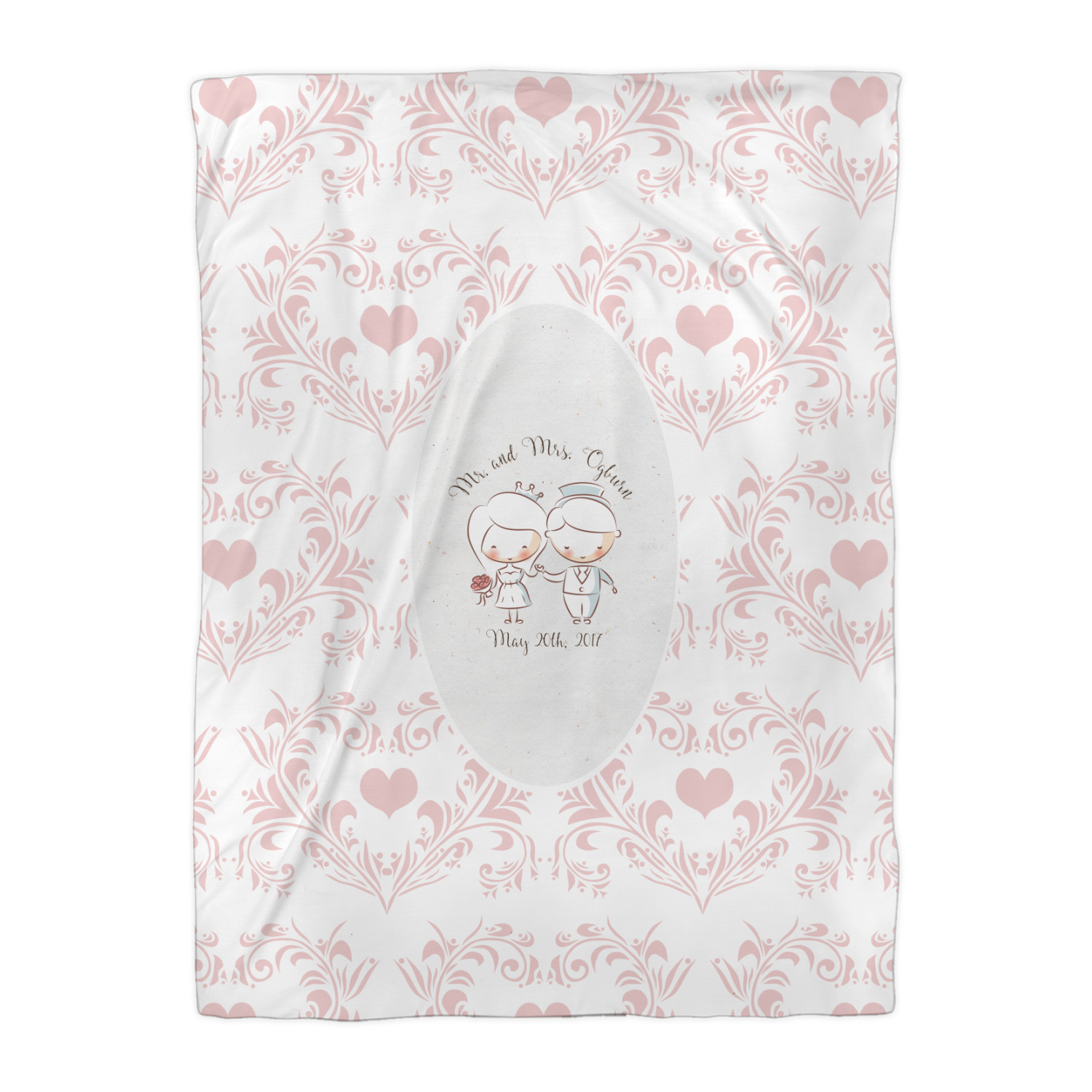 This design has an adorable bride and groom at the center of attention. They sit holding hands on a speckle textured off-white background. Above and below them is where the personalization goes, with the bride and groom's names and wedding date or whatever you choose. The textured background is a circle that surrounds the bride and groom while another background sits behind this circle. The secondary background is a white and light pink heart damask pattern, which looks adorable with the couples and their sweet rosy cheeks.