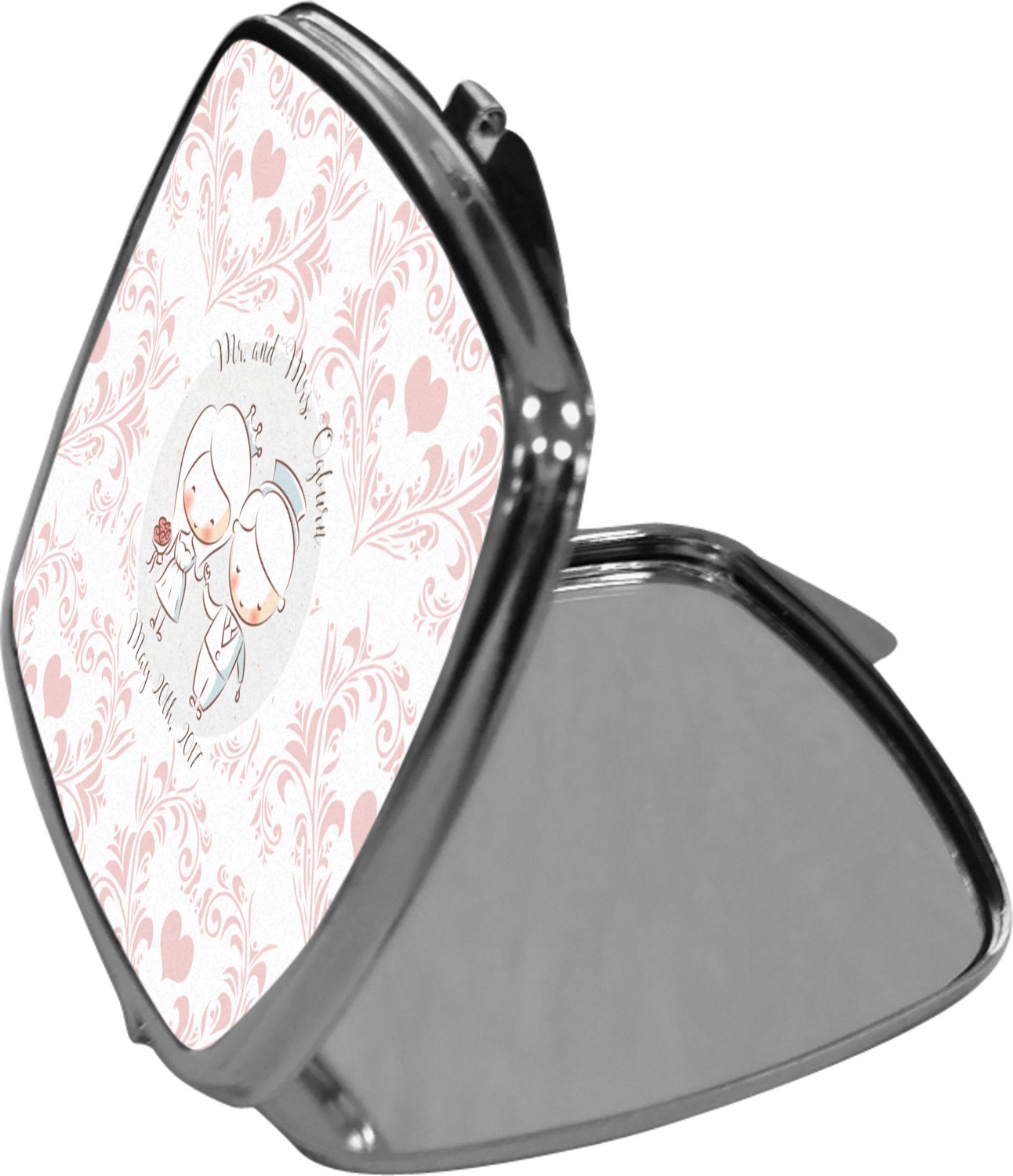Our compact mirrors are customized with your design on one side. The other side is patterned silver tone metal. Inside, there are two mirrors.