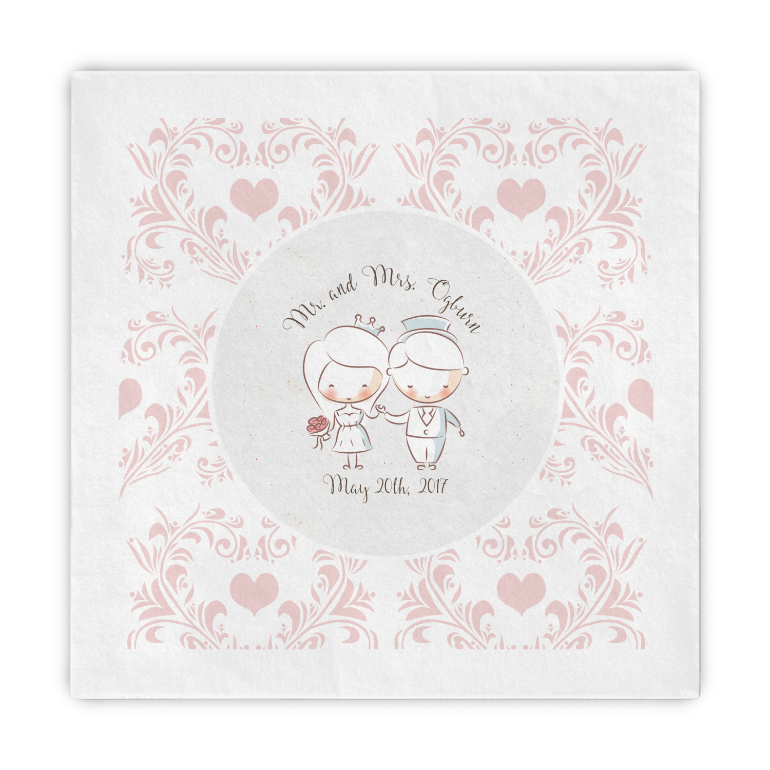 This design has an adorable bride and groom at the center of attention. They sit holding hands on a speckle textured off-white background. Above and below them is where the personalization goes, with the bride and groom's names and wedding date or whatever you choose. The textured background is a circle that surrounds the bride and groom while another background sits behind this circle. The secondary background is a white and light pink heart damask pattern, which looks adorable with the couples and their sweet rosy cheeks.