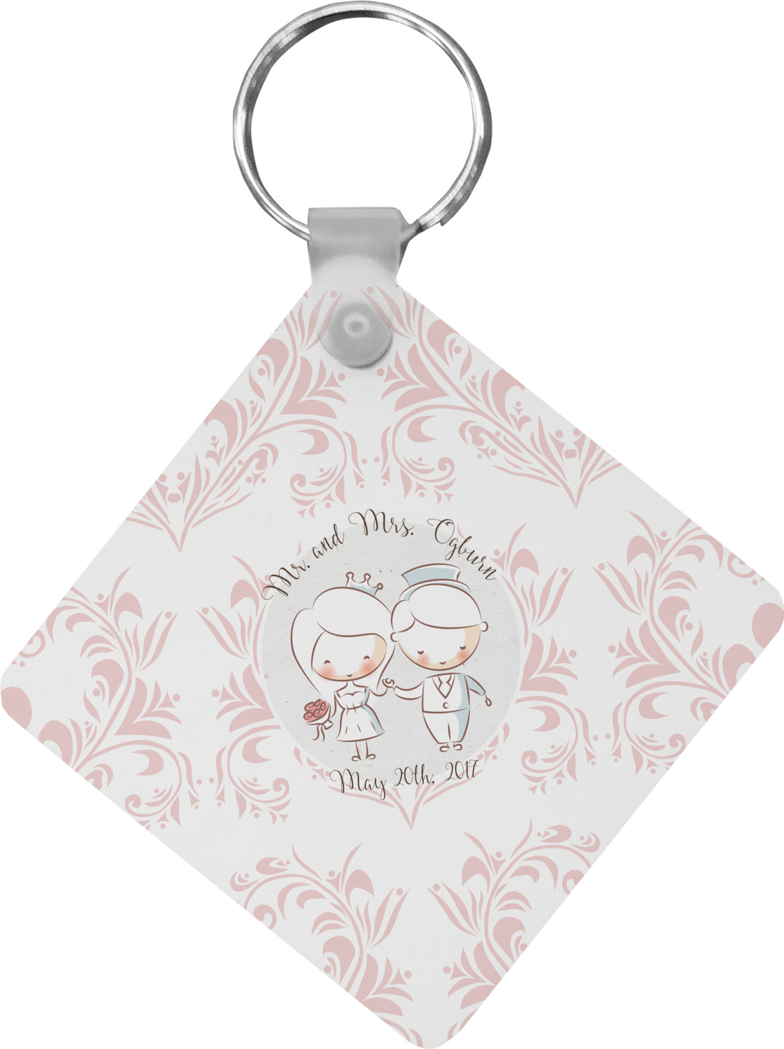 This design has an adorable bride and groom at the center of attention. They sit holding hands on a speckle textured off-white background. Above and below them is where the personalization goes, with the bride and groom's names and wedding date or whatever you choose. The textured background is a circle that surrounds the bride and groom while another background sits behind this circle. The secondary background is a white and light pink heart damask pattern, which looks adorable with the couples and their sweet rosy cheeks.