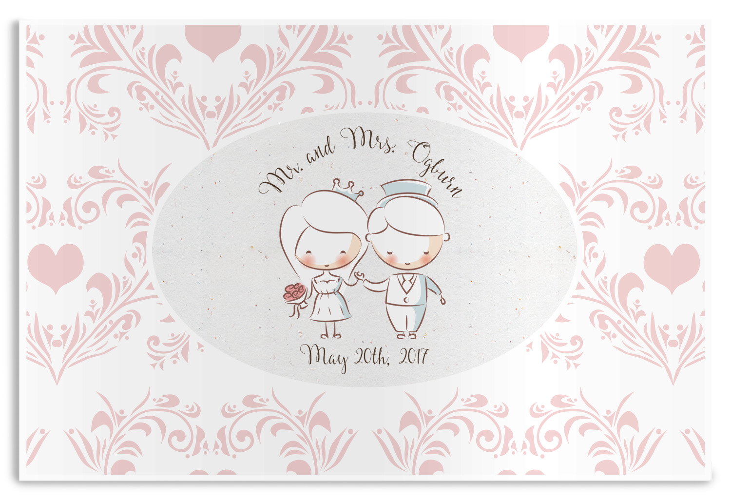 This design has an adorable bride and groom at the center of attention. They sit holding hands on a speckle textured off-white background. Above and below them is where the personalization goes, with the bride and groom's names and wedding date or whatever you choose. The textured background is a circle that surrounds the bride and groom while another background sits behind this circle. The secondary background is a white and light pink heart damask pattern, which looks adorable with the couples and their sweet rosy cheeks.