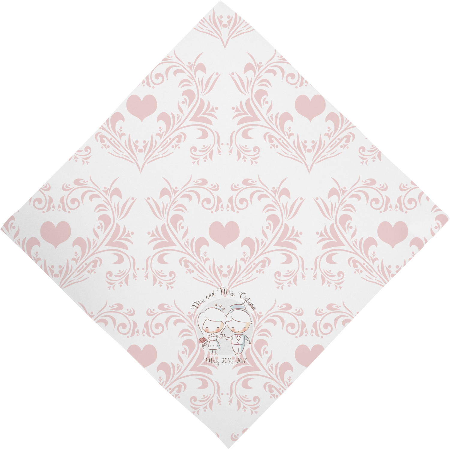 This design has an adorable bride and groom at the center of attention. They sit holding hands on a speckle textured off-white background. Above and below them is where the personalization goes, with the bride and groom's names and wedding date or whatever you choose. The textured background is a circle that surrounds the bride and groom while another background sits behind this circle. The secondary background is a white and light pink heart damask pattern, which looks adorable with the couples and their sweet rosy cheeks.