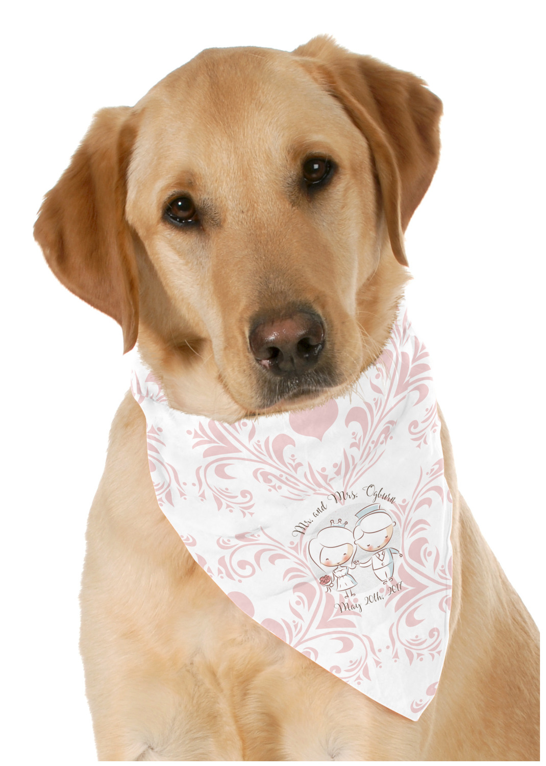 This beautiful pet bandana really is the perfect accessory. It is made from a silky feeling polyester and measures at approximately 23" x 23". Your personalization will be printed on a diagonal, so that you are able to read the personalization when folded into a triangle. This bandana fits best on large dogs, but can be folded smaller if there is no personalized text to fit smaller pets.