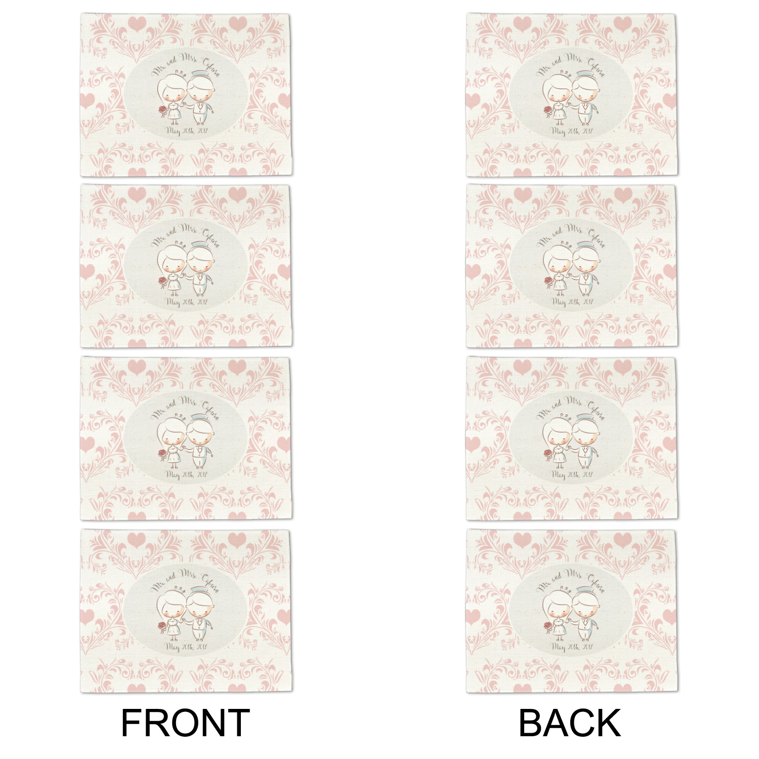 This design has an adorable bride and groom at the center of attention. They sit holding hands on a speckle textured off-white background. Above and below them is where the personalization goes, with the bride and groom's names and wedding date or whatever you choose. The textured background is a circle that surrounds the bride and groom while another background sits behind this circle. The secondary background is a white and light pink heart damask pattern, which looks adorable with the couples and their sweet rosy cheeks.