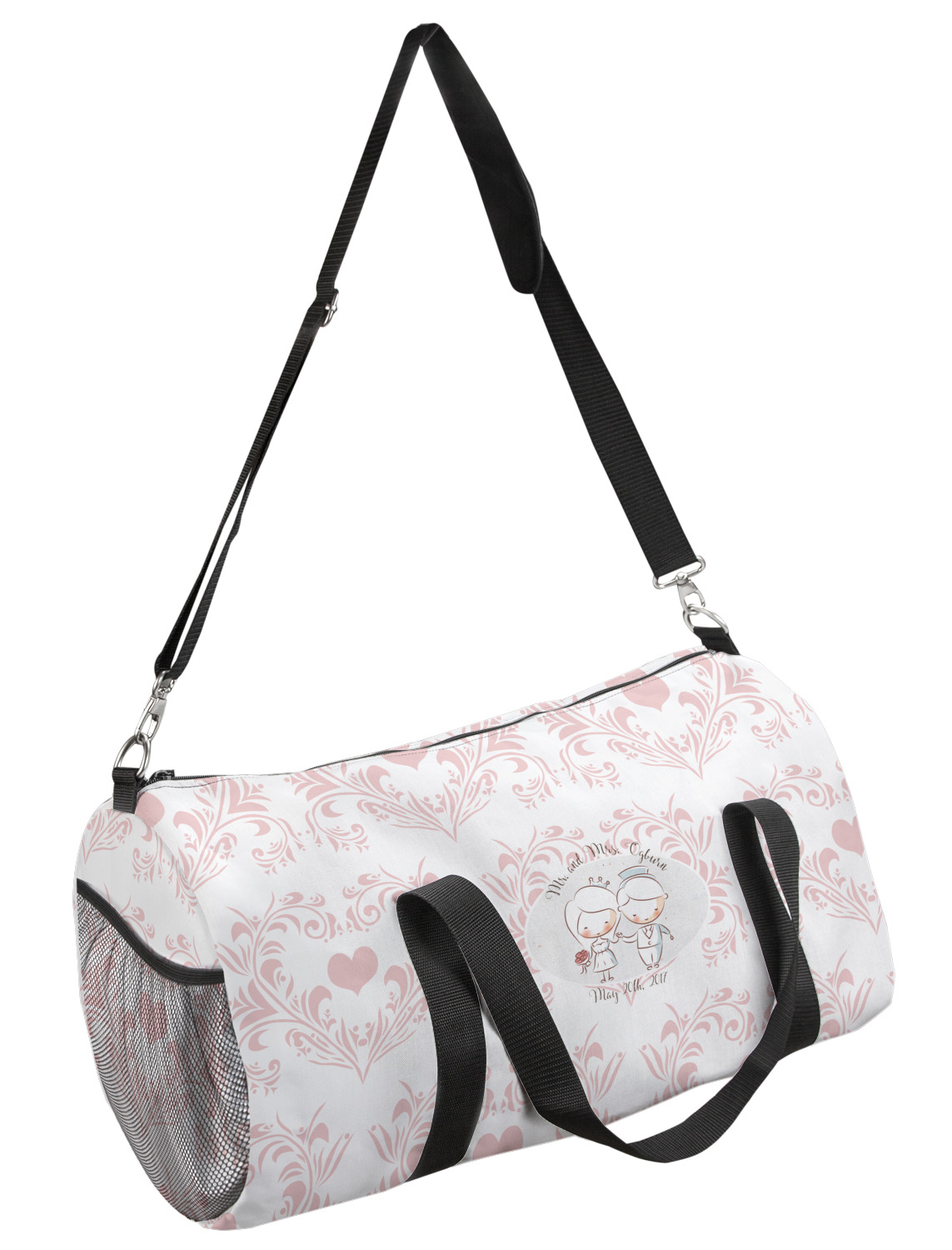 This duffle is a sturdy bag made of a canvas material. It comes in two sizes: Small (19"W x 9.5"H x 9.5"D) and Large (23"W x 12"H x 12"D). The bag is a cylindrical shape with a black adjustable strap and two handles. On one side is an elastic pouch to put a waterbottle or other small item. Your product will be sublimated with your design and is able to be designed on the front, back, and sides. Be sure to remember that the straps may cut into parts of your design if you upload your own artwork.