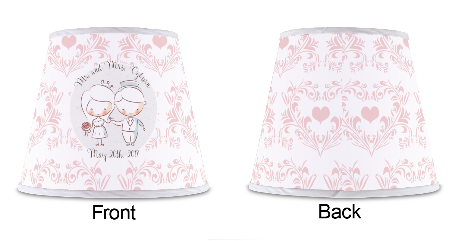 This design has an adorable bride and groom at the center of attention. They sit holding hands on a speckle textured off-white background. Above and below them is where the personalization goes, with the bride and groom's names and wedding date or whatever you choose. The textured background is a circle that surrounds the bride and groom while another background sits behind this circle. The secondary background is a white and light pink heart damask pattern, which looks adorable with the couples and their sweet rosy cheeks.