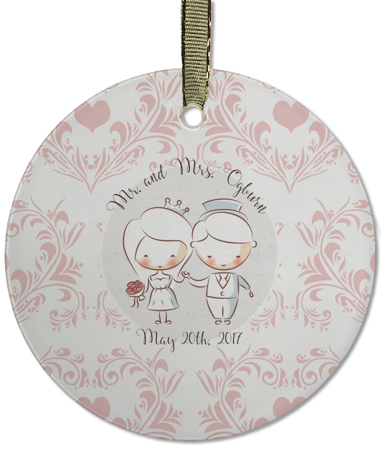 This design has an adorable bride and groom at the center of attention. They sit holding hands on a speckle textured off-white background. Above and below them is where the personalization goes, with the bride and groom's names and wedding date or whatever you choose. The textured background is a circle that surrounds the bride and groom while another background sits behind this circle. The secondary background is a white and light pink heart damask pattern, which looks adorable with the couples and their sweet rosy cheeks.