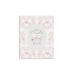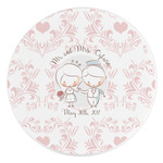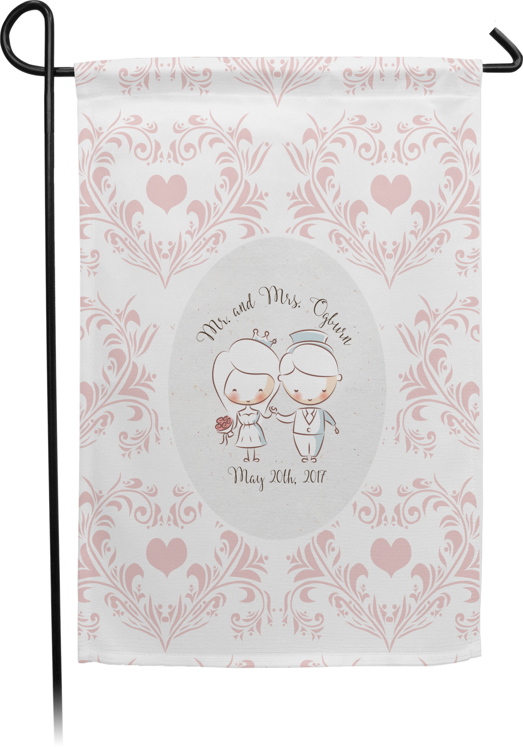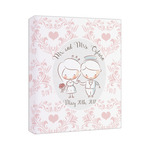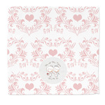 This design has an adorable bride and groom at the center of attention. They sit holding hands on a speckle textured off-white background. Above and below them is where the personalization goes, with the bride and groom's names and wedding date or whatever you choose. The textured background is a circle that surrounds the bride and groom while another background sits behind this circle. The secondary background is a white and light pink heart damask pattern, which looks adorable with the couples and their sweet rosy cheeks.