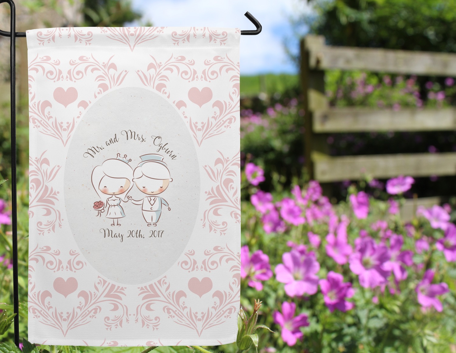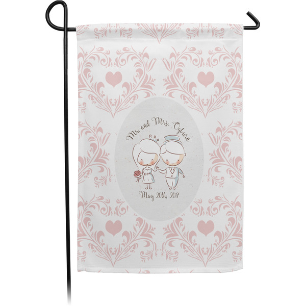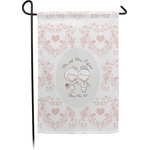 These custom garden flags are made of a durable, double-ply, polyester weave, allowing them to withstand the elements year round. The small flags measure at approximately 12 by 18 inches. The large flags measure out to 28 by 37 inches. You can order these decorative flags with your customization printed on the front only, or the front and back.