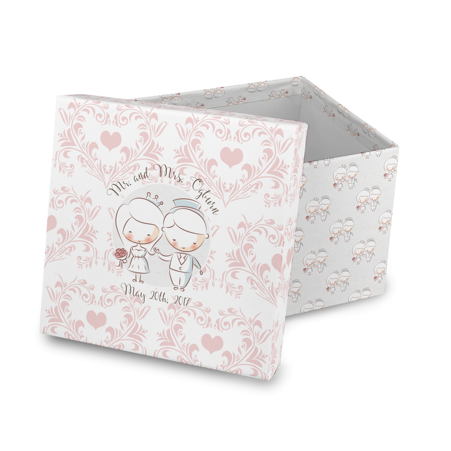 This design has an adorable bride and groom at the center of attention. They sit holding hands on a speckle textured off-white background. Above and below them is where the personalization goes, with the bride and groom's names and wedding date or whatever you choose. The textured background is a circle that surrounds the bride and groom while another background sits behind this circle. The secondary background is a white and light pink heart damask pattern, which looks adorable with the couples and their sweet rosy cheeks.