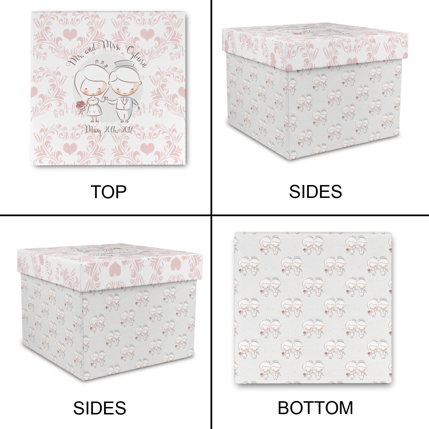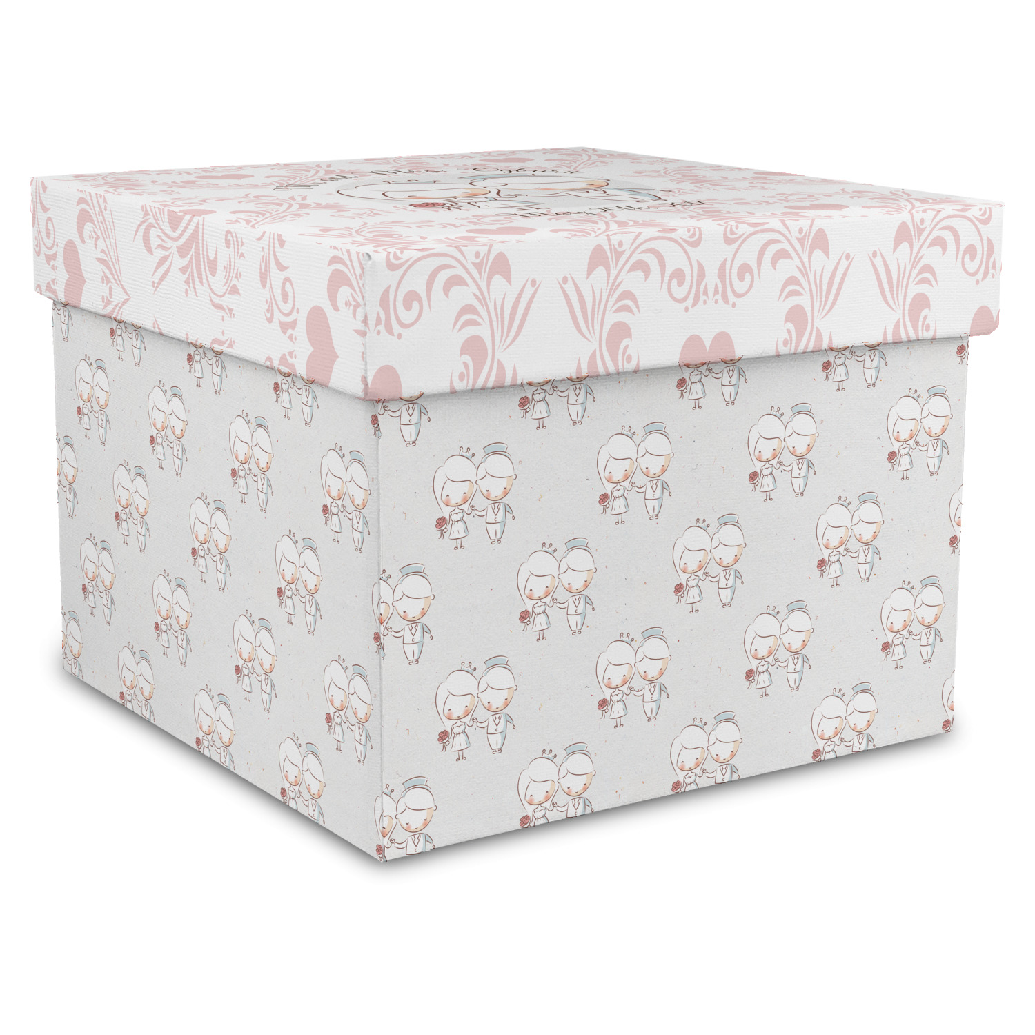 This design has an adorable bride and groom at the center of attention. They sit holding hands on a speckle textured off-white background. Above and below them is where the personalization goes, with the bride and groom's names and wedding date or whatever you choose. The textured background is a circle that surrounds the bride and groom while another background sits behind this circle. The secondary background is a white and light pink heart damask pattern, which looks adorable with the couples and their sweet rosy cheeks.