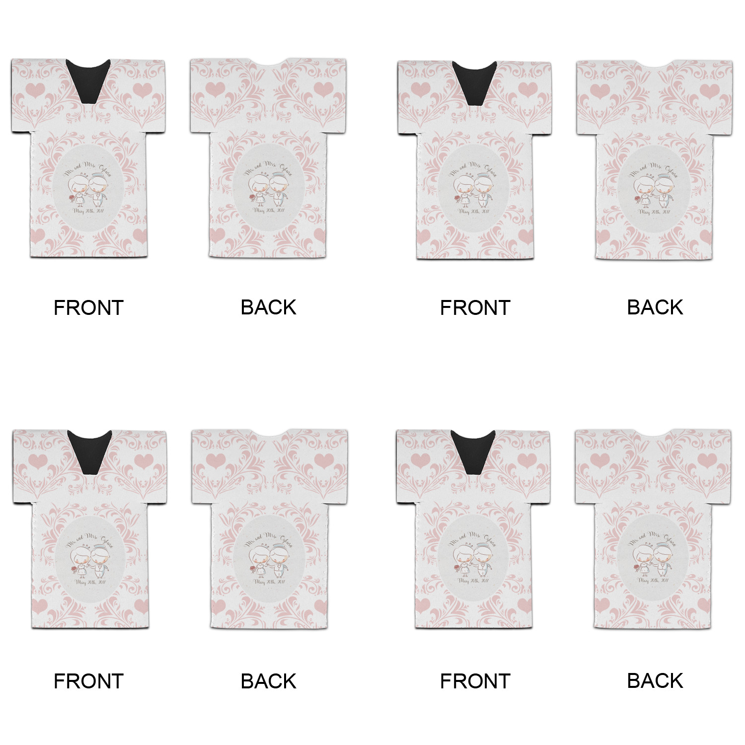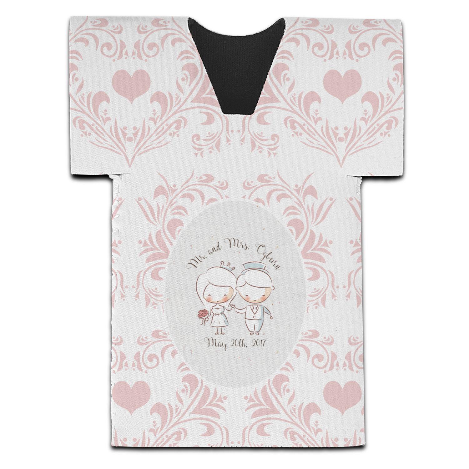 This design has an adorable bride and groom at the center of attention. They sit holding hands on a speckle textured off-white background. Above and below them is where the personalization goes, with the bride and groom's names and wedding date or whatever you choose. The textured background is a circle that surrounds the bride and groom while another background sits behind this circle. The secondary background is a white and light pink heart damask pattern, which looks adorable with the couples and their sweet rosy cheeks.