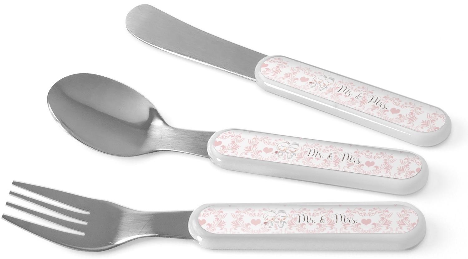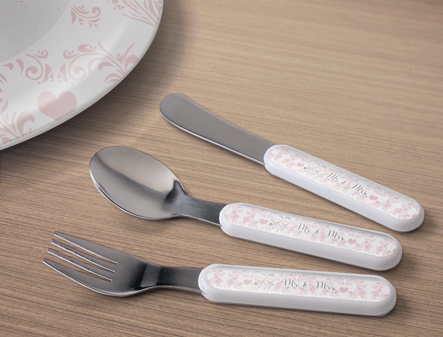 This set of kids' silverware includes a 5.5 inch spoon, fork, and knife, catered to your little one's needs. The prongs of this fork are flat and dull, while our spoon is small enough for tiny mouths, and the dullness of the knife itself resembles a butter knife, at most. These kids' utensils are made of stainless steel, while the handles are crafted from a durable plastic that will withstand the energy and use of your young one. We print your customization across the handles, making the cutlery set unique to your child only.