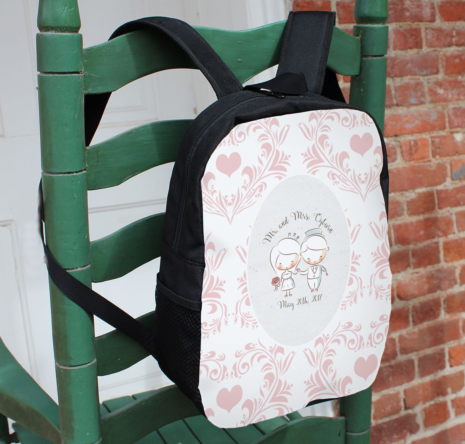 This design has an adorable bride and groom at the center of attention. They sit holding hands on a speckle textured off-white background. Above and below them is where the personalization goes, with the bride and groom's names and wedding date or whatever you choose. The textured background is a circle that surrounds the bride and groom while another background sits behind this circle. The secondary background is a white and light pink heart damask pattern, which looks adorable with the couples and their sweet rosy cheeks.