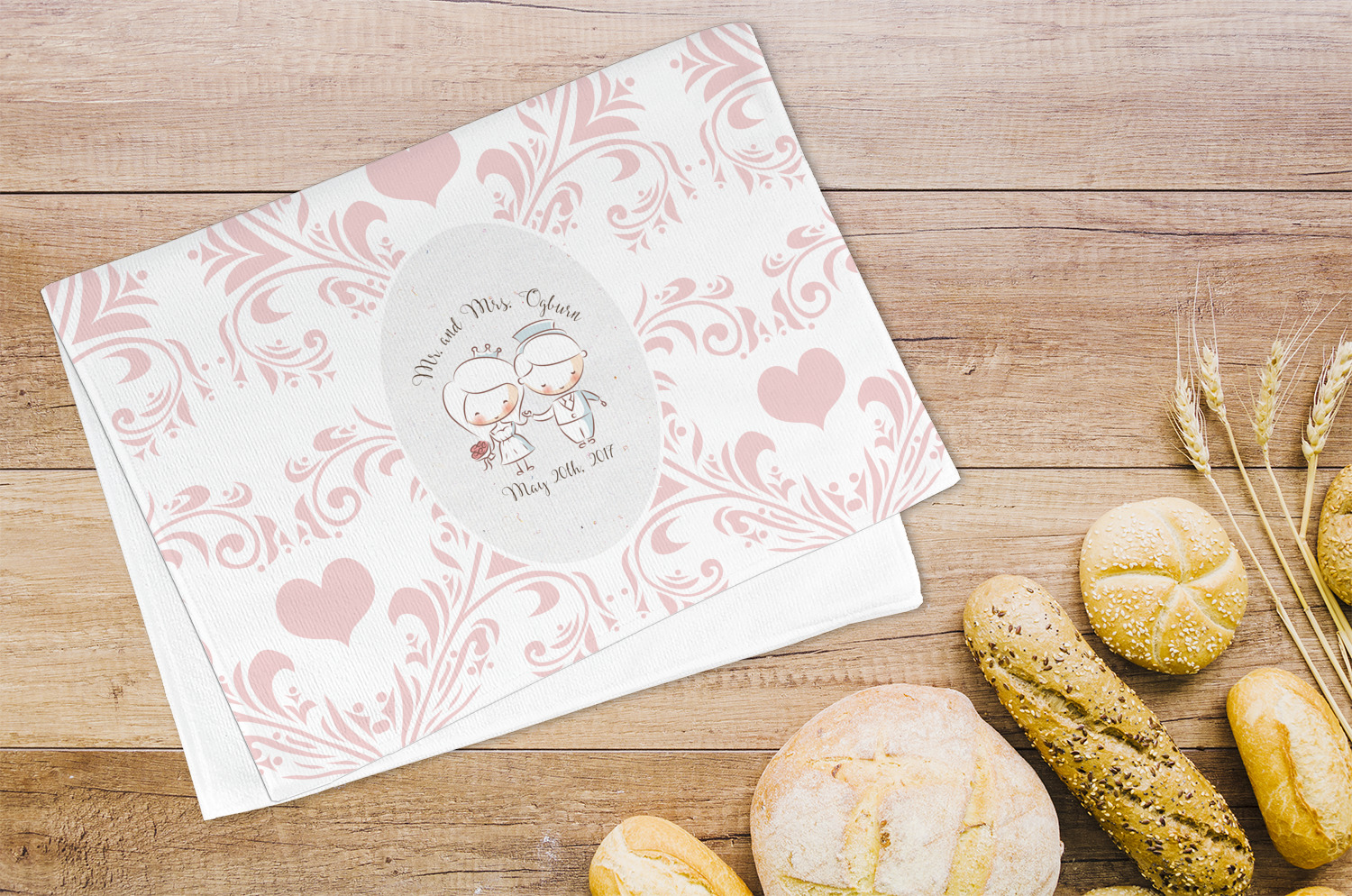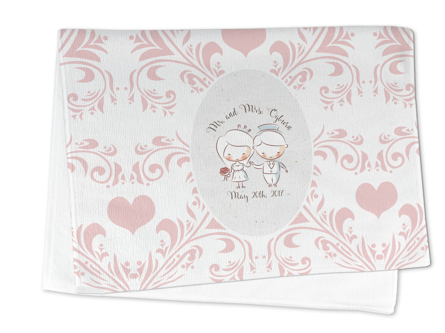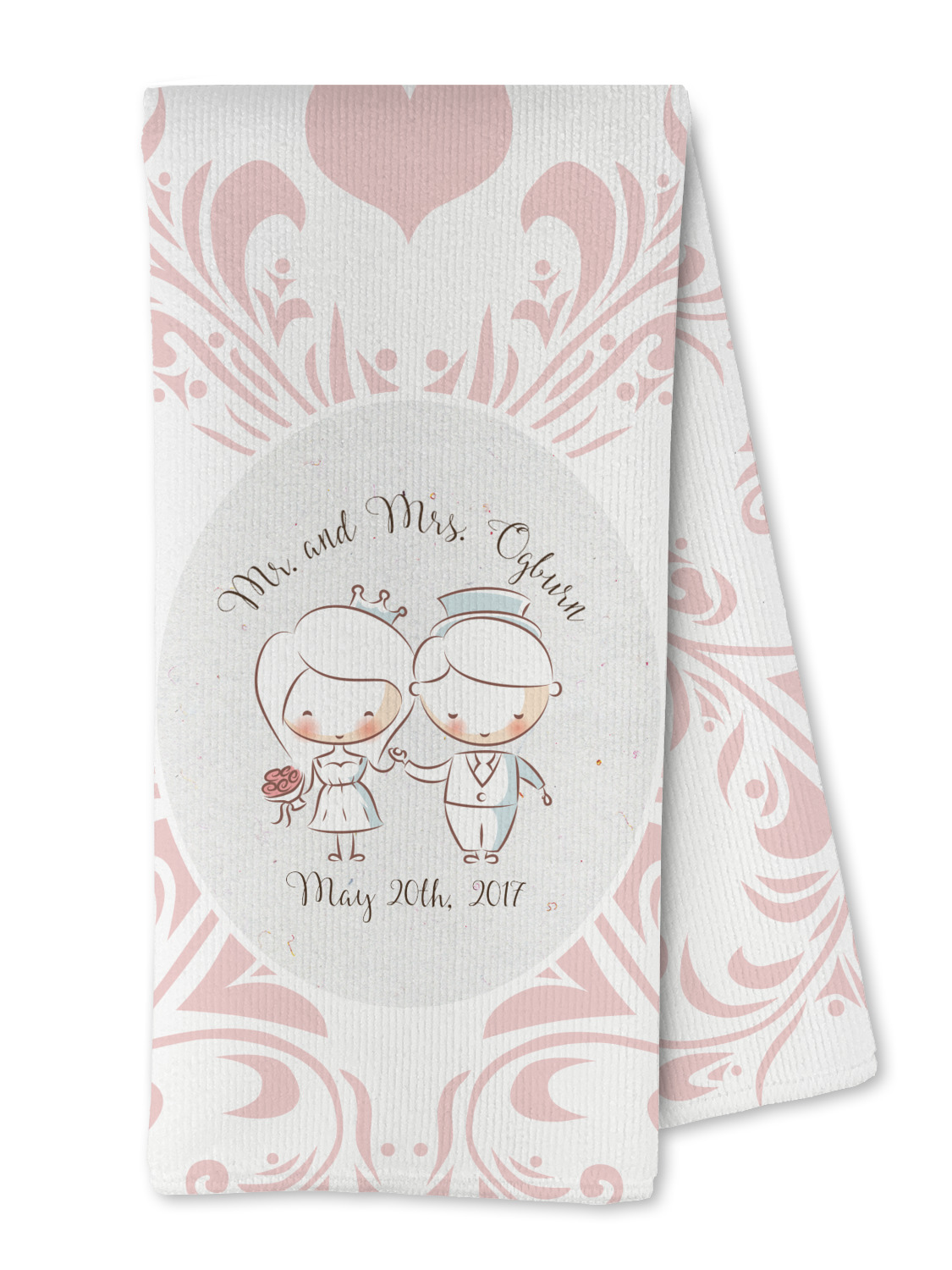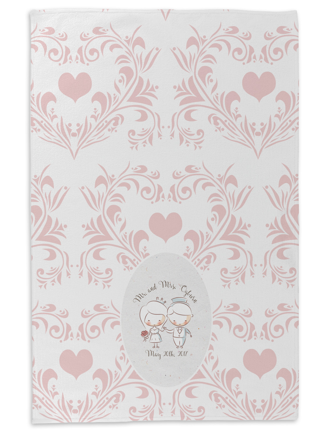 This design has an adorable bride and groom at the center of attention. They sit holding hands on a speckle textured off-white background. Above and below them is where the personalization goes, with the bride and groom's names and wedding date or whatever you choose. The textured background is a circle that surrounds the bride and groom while another background sits behind this circle. The secondary background is a white and light pink heart damask pattern, which looks adorable with the couples and their sweet rosy cheeks.