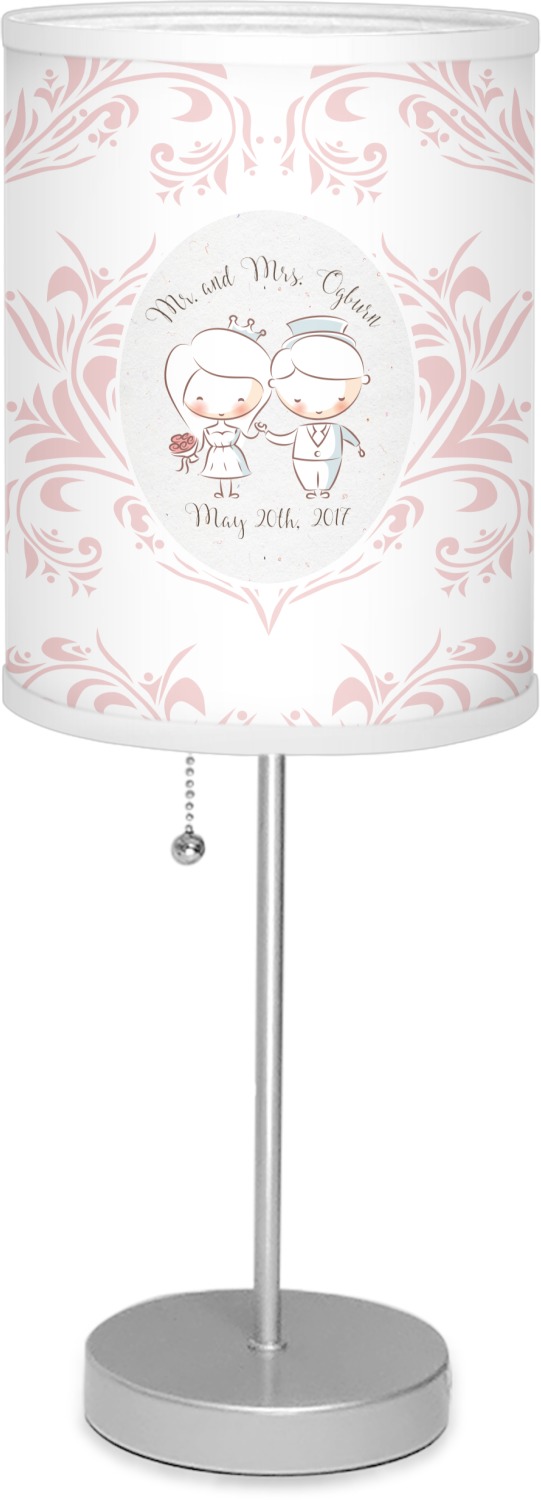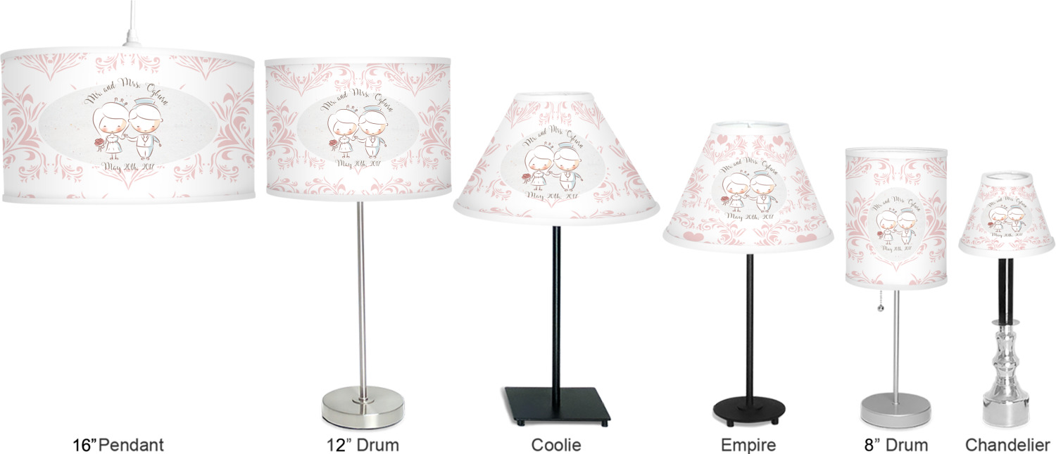 This design has an adorable bride and groom at the center of attention. They sit holding hands on a speckle textured off-white background. Above and below them is where the personalization goes, with the bride and groom's names and wedding date or whatever you choose. The textured background is a circle that surrounds the bride and groom while another background sits behind this circle. The secondary background is a white and light pink heart damask pattern, which looks adorable with the couples and their sweet rosy cheeks.
