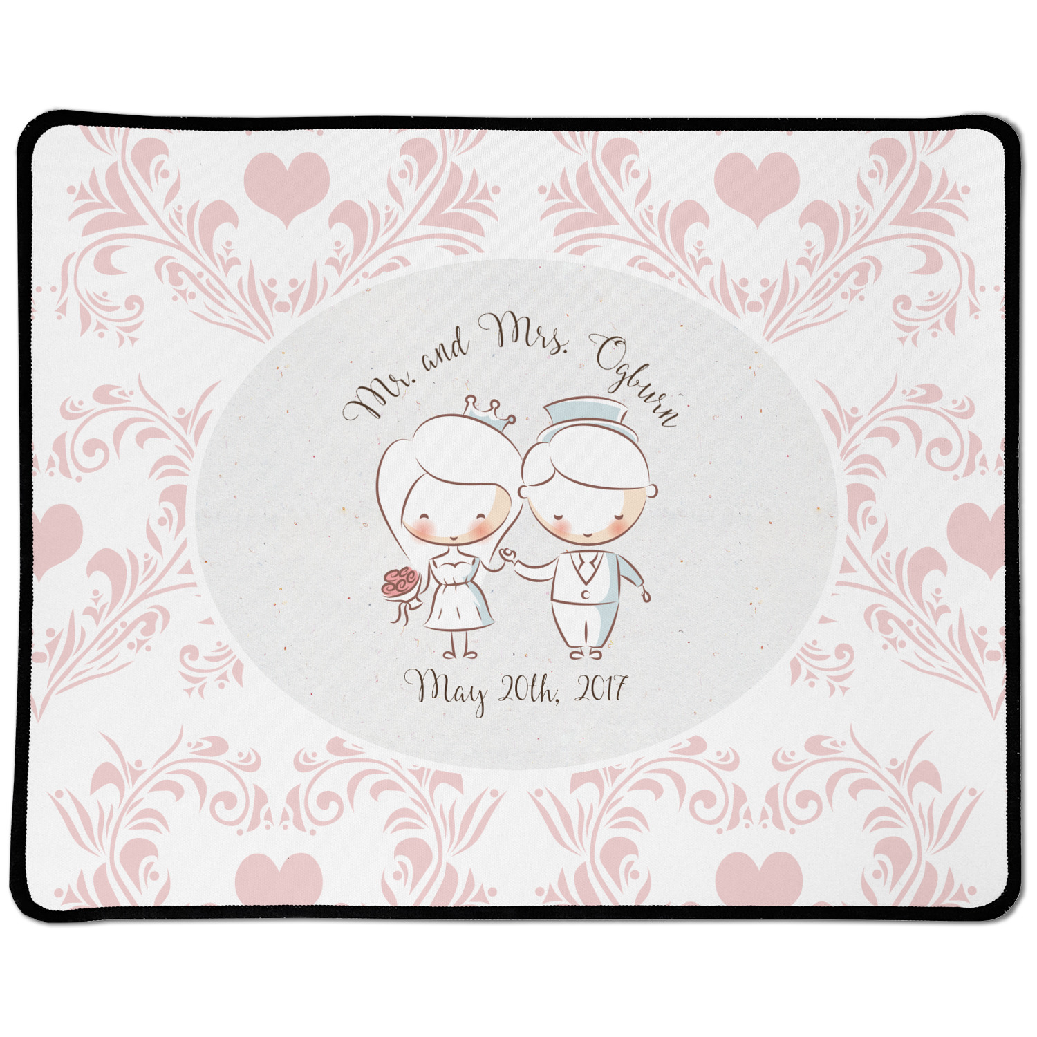 This design has an adorable bride and groom at the center of attention. They sit holding hands on a speckle textured off-white background. Above and below them is where the personalization goes, with the bride and groom's names and wedding date or whatever you choose. The textured background is a circle that surrounds the bride and groom while another background sits behind this circle. The secondary background is a white and light pink heart damask pattern, which looks adorable with the couples and their sweet rosy cheeks.