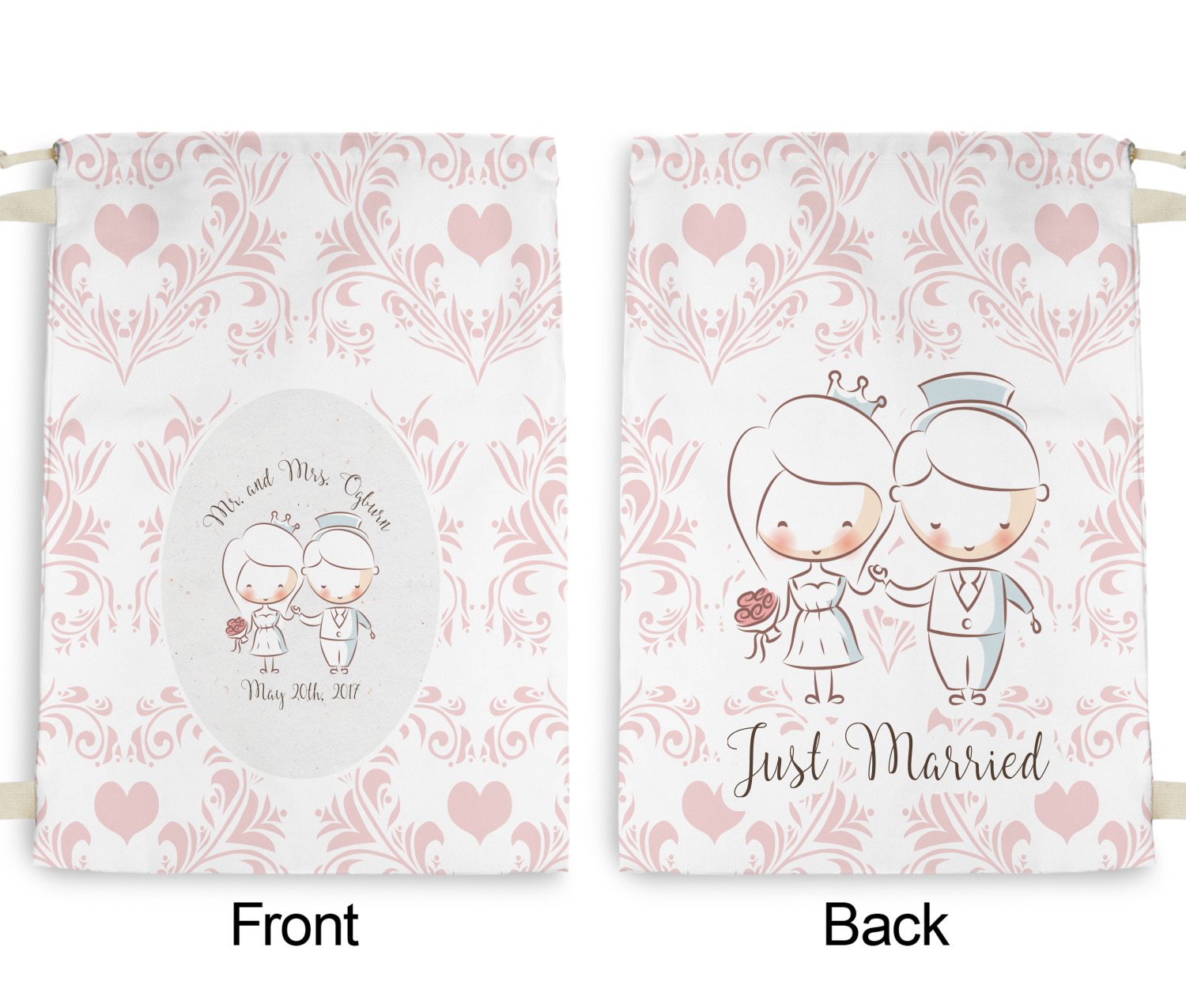 This design has an adorable bride and groom at the center of attention. They sit holding hands on a speckle textured off-white background. Above and below them is where the personalization goes, with the bride and groom's names and wedding date or whatever you choose. The textured background is a circle that surrounds the bride and groom while another background sits behind this circle. The secondary background is a white and light pink heart damask pattern, which looks adorable with the couples and their sweet rosy cheeks.