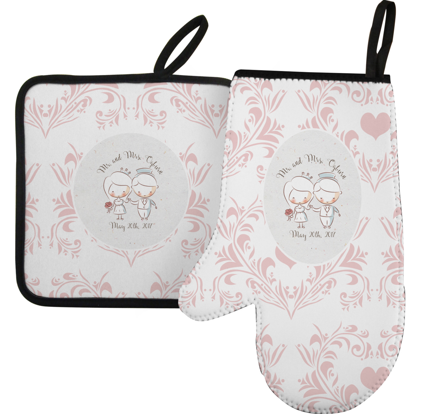 This design has an adorable bride and groom at the center of attention. They sit holding hands on a speckle textured off-white background. Above and below them is where the personalization goes, with the bride and groom's names and wedding date or whatever you choose. The textured background is a circle that surrounds the bride and groom while another background sits behind this circle. The secondary background is a white and light pink heart damask pattern, which looks adorable with the couples and their sweet rosy cheeks.